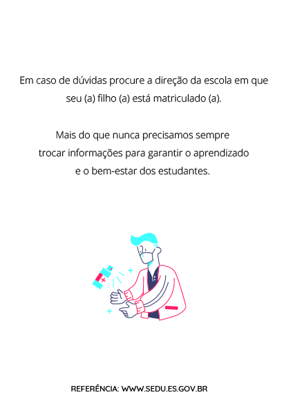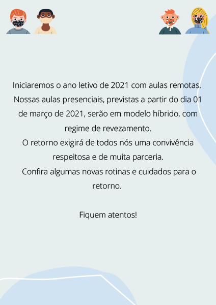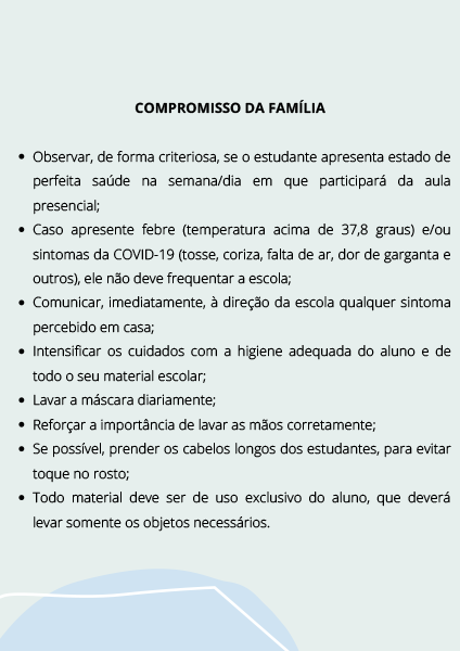 O uso de máscara, a utilização exclusiva do material escolar pelo aluno, a intensificação dos cuidados com a higiene e observar e comunicar os sintomas da Covid-19 são ações obrigatórias neste retorno. Confira mais detalhes no “Guia da Família”, ao clicar AQUI.