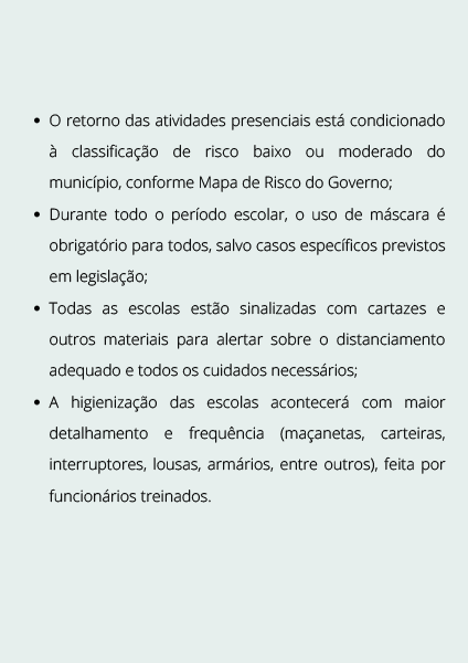 As aulas presenciais serão mantidas conforme a classificação de risco baixo ou moderado do Município, seguindo o Mapa de Risco do Governo que recebe atualização semanal.