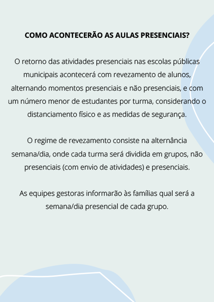 O retorno das atividades presenciais nas escolas públicas municipais acontecerá com regime de revezamento de alunos, alternando momentos presenciais e não presenciais, e com um número menor de estudantes por turma, considerando o distanciamento físico e as medidas de segurança. O cronograma de revezamento de volta às aulas já foi enviado para as famílias pela escola em que o estudante está matriculado.