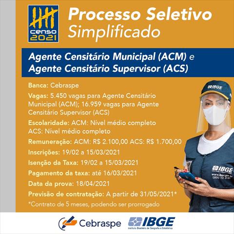 As vagas são temporárias e os contratos terão duração prevista de três meses para a função de recenseador e de cinco meses para ACM e ACS, podendo ser renovados de acordo com as necessidades do IBGE e a disponibilidade orçamentária. A contratação temporária é regida pela Lei nº 8.745/1993.