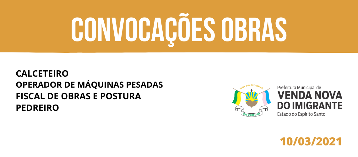 A Prefeitura de Venda Nova do Imigrante, por meio da Secretaria Municipal de Obras e Infraestrutura Urbana, convoca nesta quarta-feira (10) profissionais de excepcional interesse público, considerando o disposto no Edital N° 002/2020. As chamadas são para os cargos de calceteiro, operador de máquinas pesadas, fiscal de obras e postura e pedreiro.