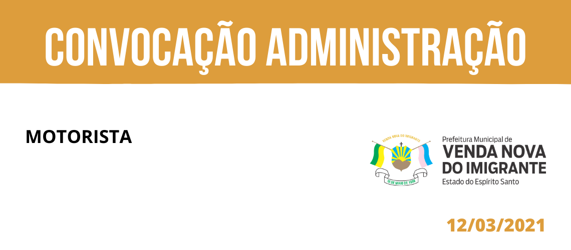 A Prefeitura de Venda Nova do Imigrante, por meio da Secretaria Municipal de Administração, convoca nesta sexta-feira (12) profissional de excepcional interesse público, considerando o disposto no Edital N° 002/2020. A chamada é para o cargo de motorista.