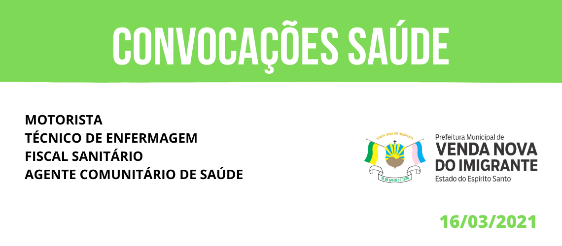 A Prefeitura de Venda Nova do Imigrante, por meio da Secretaria Municipal de Saúde, convoca nesta terça-feira (16) profissionais considerando o disposto no Edital N° 002/2020. As chamadas são para os cargos de motorista, técnico de enfermagem, fiscal sanitário e agente comunitário de saúde.