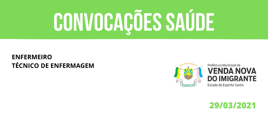 A Prefeitura de Venda Nova do Imigrante, por meio da Secretaria Municipal de Saúde, convoca nesta segunda-feira (29) profissionais considerando o disposto no Edital N° 002/2020. As Chamada são para os cargos de Enfermeiro e Técnico de Enfermagem.