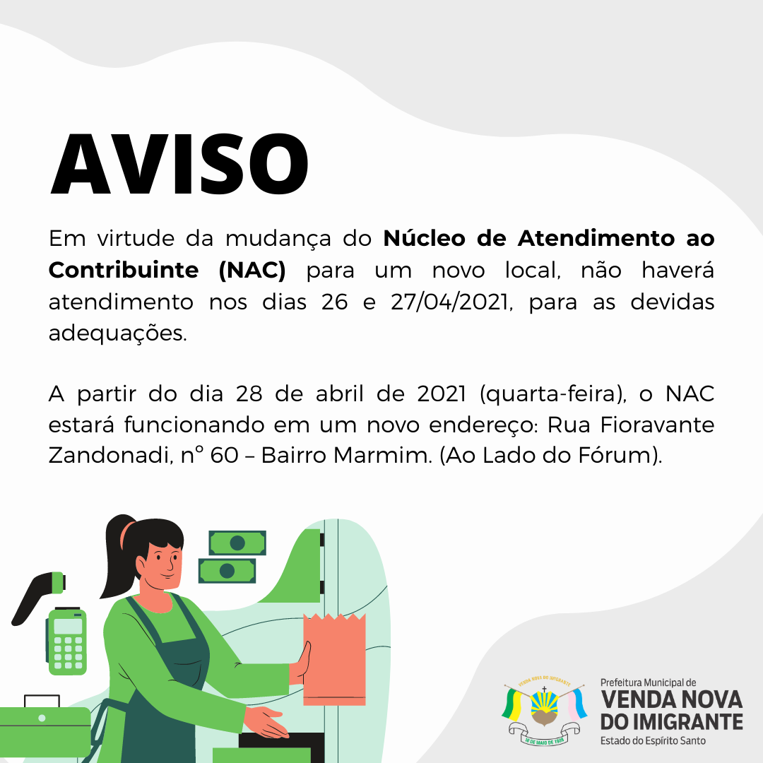 A partir do dia 28 de abril de 2021, o Núcleo de Atendimento ao Contribuinte (NAC), está funcionando em um novo endereço: Rua Fioravante Zandonadi, nº 60 – Bairro Marmim. (Ao Lado do Fórum).