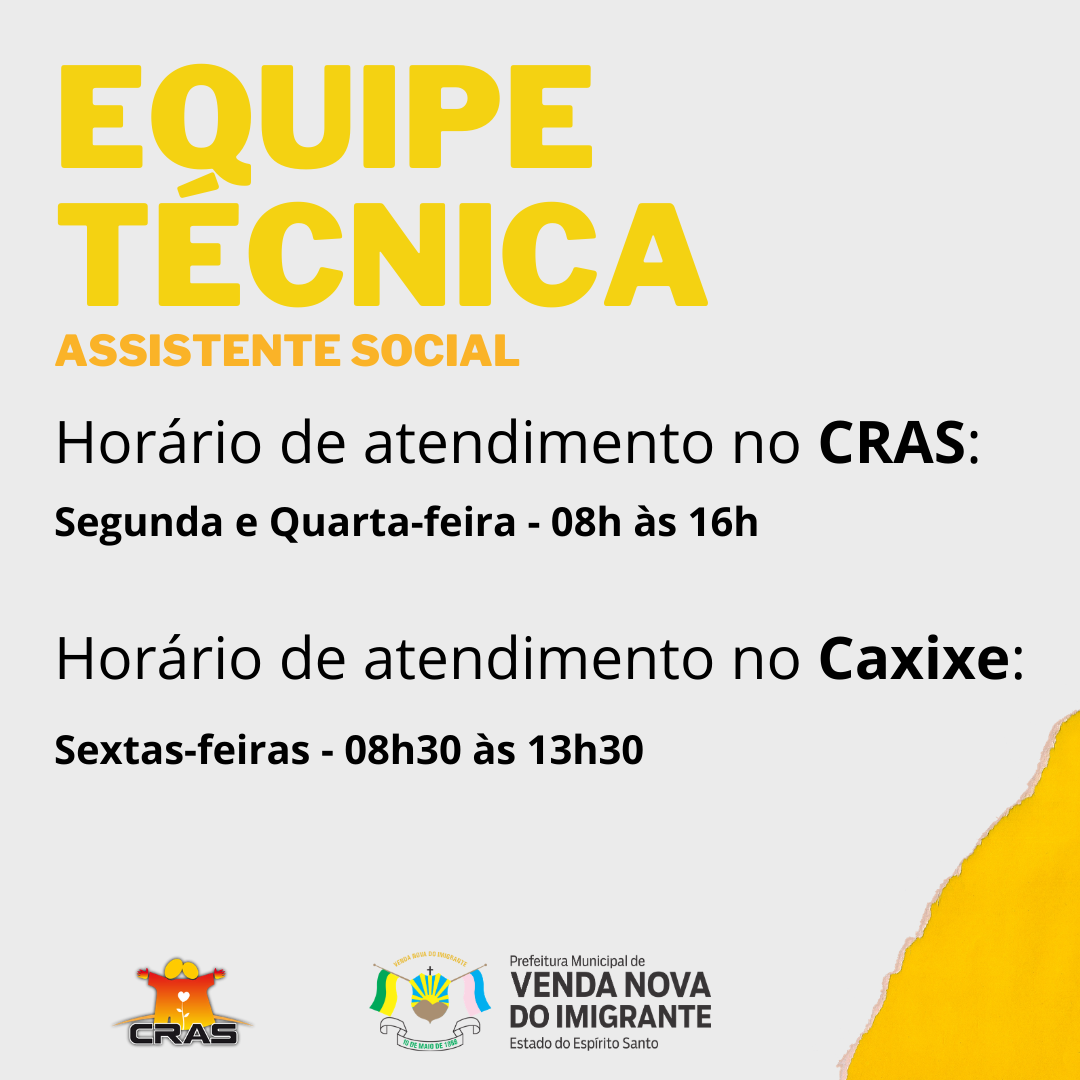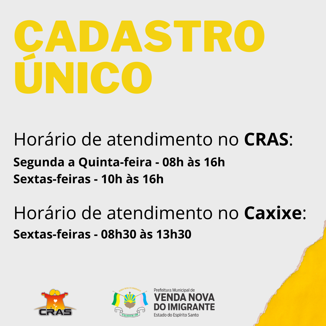 A Secretaria Municipal de Assistência Social, através do Centro de Referência de Assistência Social – CRAS, vai ampliar o serviço de atendimento do Cadastro Único e atendimento com equipe técnica para a comunidade do Caxixe. A partir do dia 30 de abril, os atendimentos serão realizados todas as sextas-feiras, de 08h30 às 13h30, no Projeto Semear, anexo ao Correio.