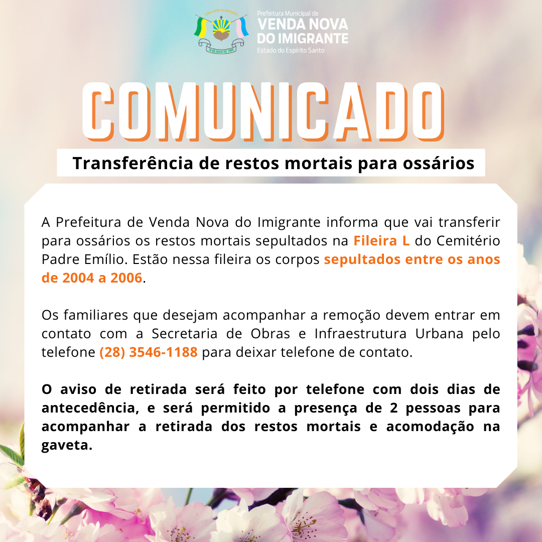 A Prefeitura de Venda Nova do Imigrante informa que vai transferir para ossários os restos mortais sepultados na Fileira L do Cemitério Padre Emílio. Estão nessa fileira os corpos sepultados entre os anos de 2004 a 2006.