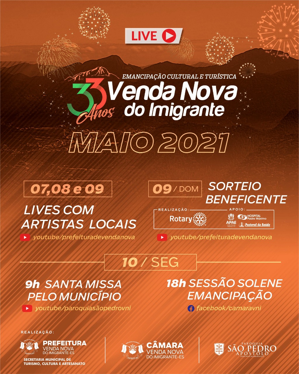 O Município de Venda Nova do Imigrante vai completar 33 anos de emancipação político-administrativa no próximo dia 10 de maio. Em virtude da pandemia do novo coronavírus, a comemoração será virtual, do dia 07 ao dia 10 de maio.