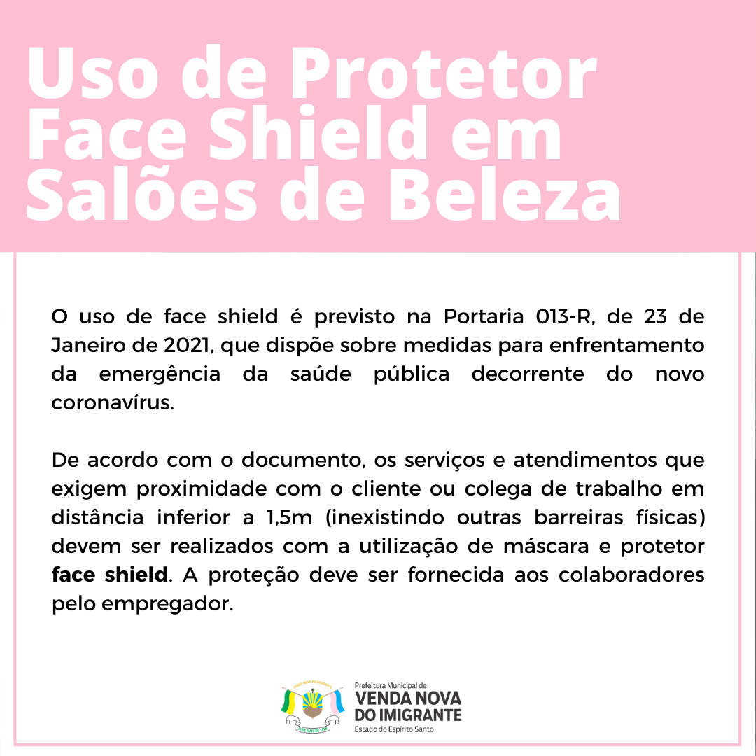 De forma a impedir o avanço do coronavírus no Município, a Secretaria Municipal da Saúde de Venda Nova do Imigrante, através da Vigilância Sanitária, realizará um trabalho de conscientização dos estabelecimentos de salão de beleza sobre o uso obrigatório de protetor face shield a partir dessa segunda-feira (01).