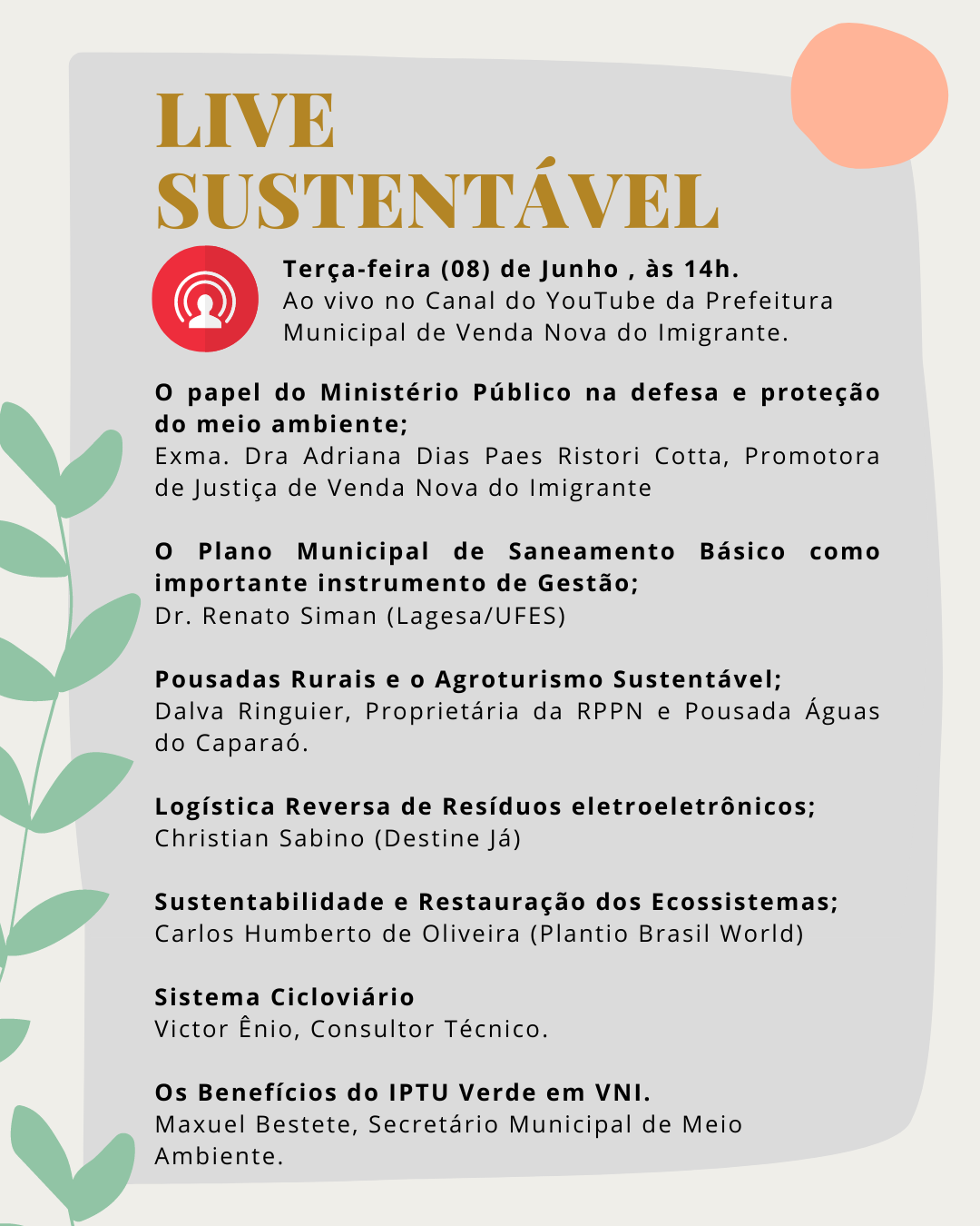 Na quarta-feira (02), haverá palestras na Emei Honorio Pizzol e EMEF Atilio Pizzol. Na terça-feira (08) às 14h, dentro da programação especial haverá a Live Sustentável, que contará com a presença de diversos convidados abordando diversos assuntos relacionados à área ambiental e gestão pública. A live será transmitida pelo canal da Prefeitura Municipal de Venda Nova do Imigrante pelo Youtube. Acesse AQUI. Durante a noite, às 18h30, na EEEF Liberal Zandonadi, os estudantes acompanharão uma palestra sobre Reciclagem.