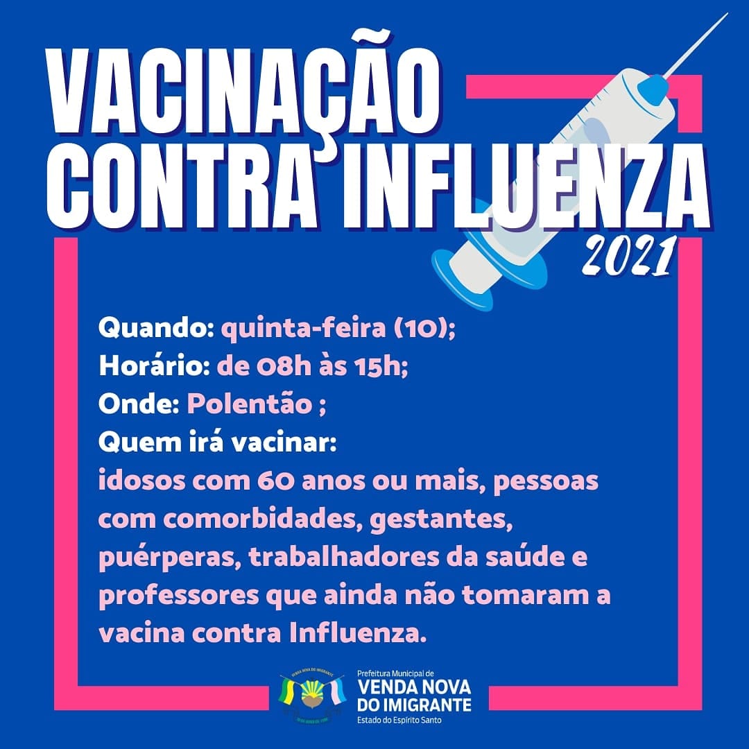 A Prefeitura Municipal de Venda Nova do Imigrante, através da Secretaria Municipal de Saúde, continua  a vacinação contra a Influenza nos munícipes.