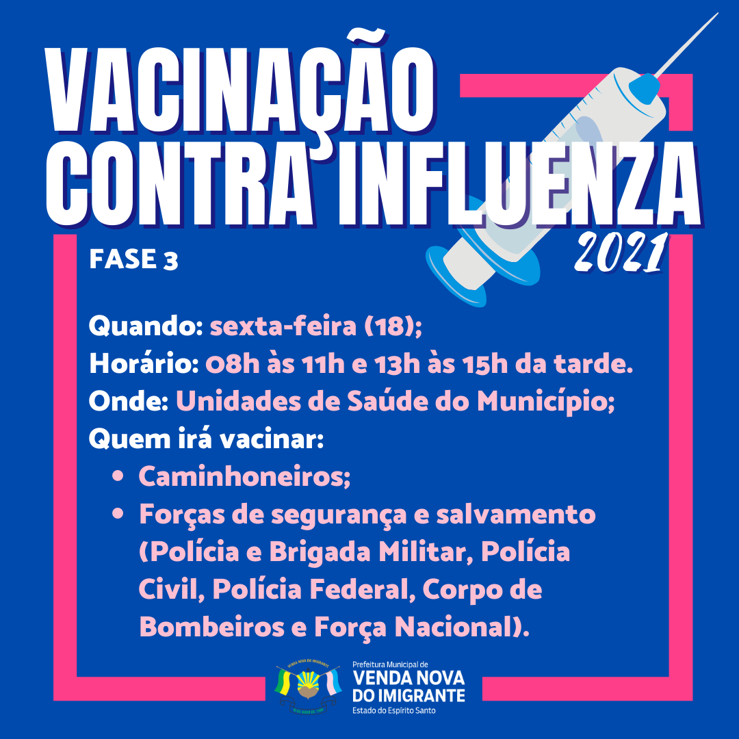 A imunização contra o vírus da influenza continua. A Prefeitura de Venda Nova do Imigrante, através da Secretaria Municipal de Saúde, dará continuidade nesta sexta-feira (18) a terceira fase da campanha de vacinação dos munícipes.