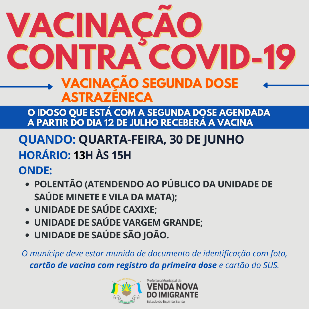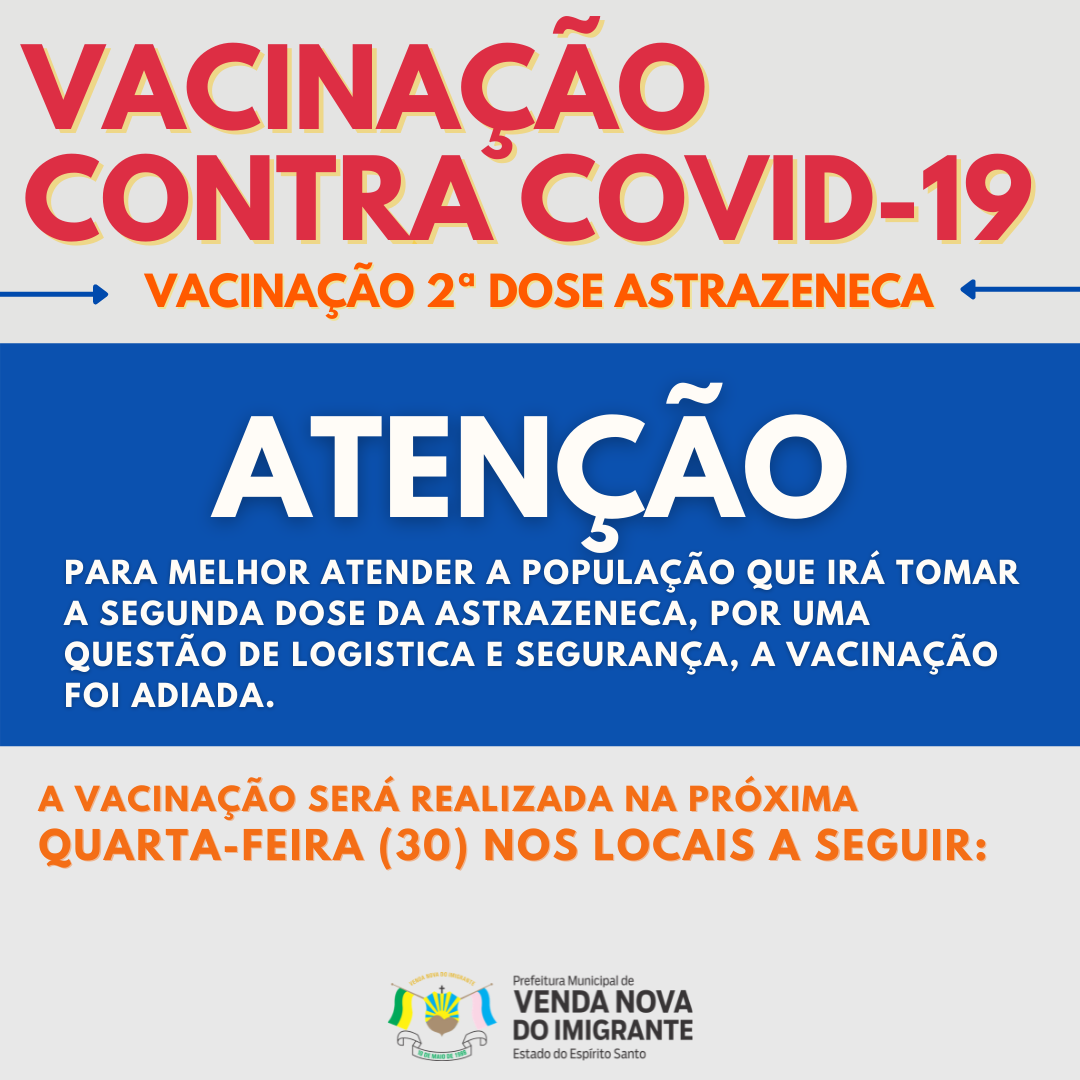 Para melhor atender a população que irá tomar a segunda dose da AstraZeneca, por uma questão de logística e segurança, a vacinação foi ADIADA. A vacinação será realizada na próxima quarta-feira (30). As agentes de saúde já estão entrando em contato com a população. O idoso que está com a segunda dose agendada a partir do dia 12 de Julho receberá a segunda dose do imunizante.