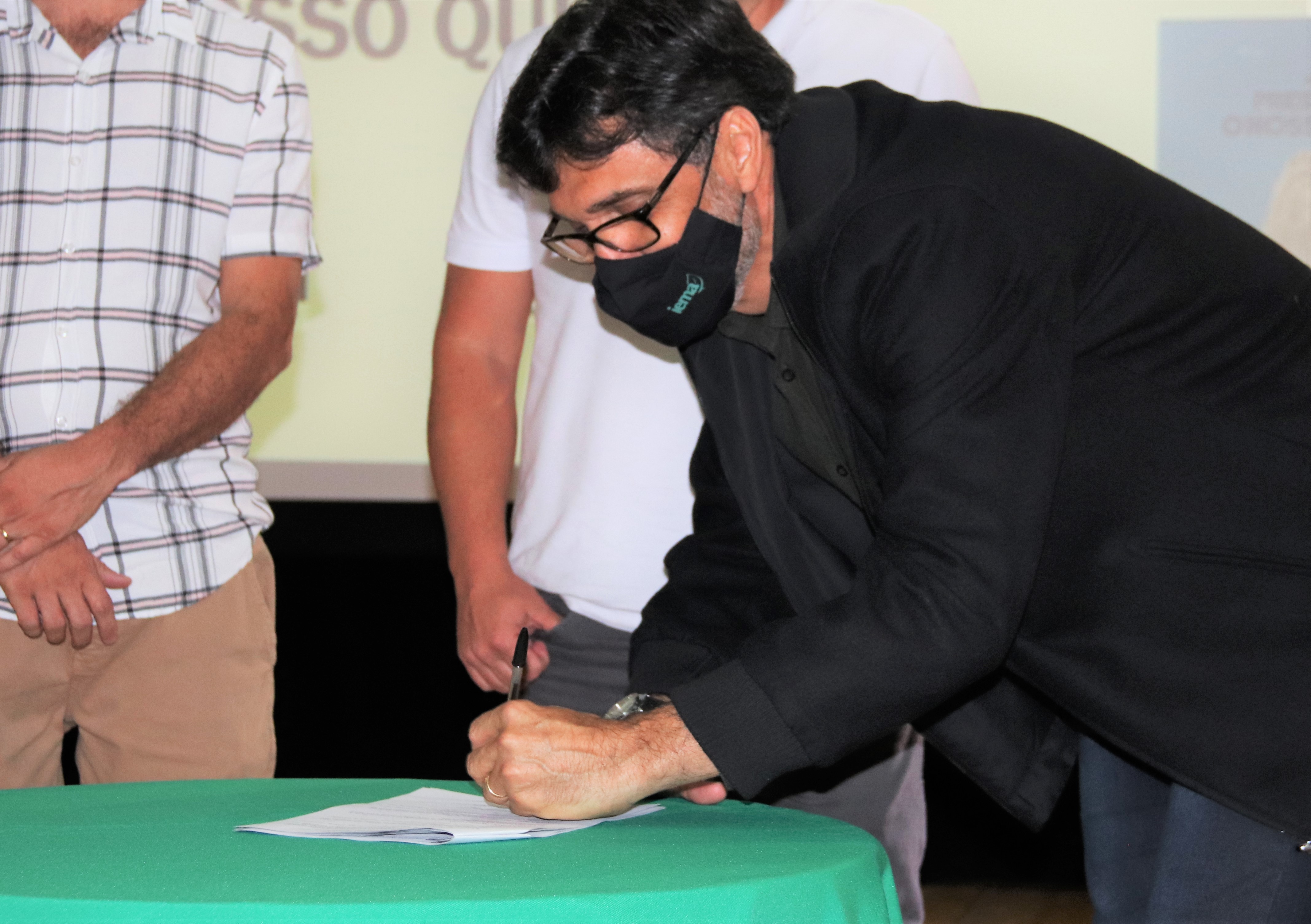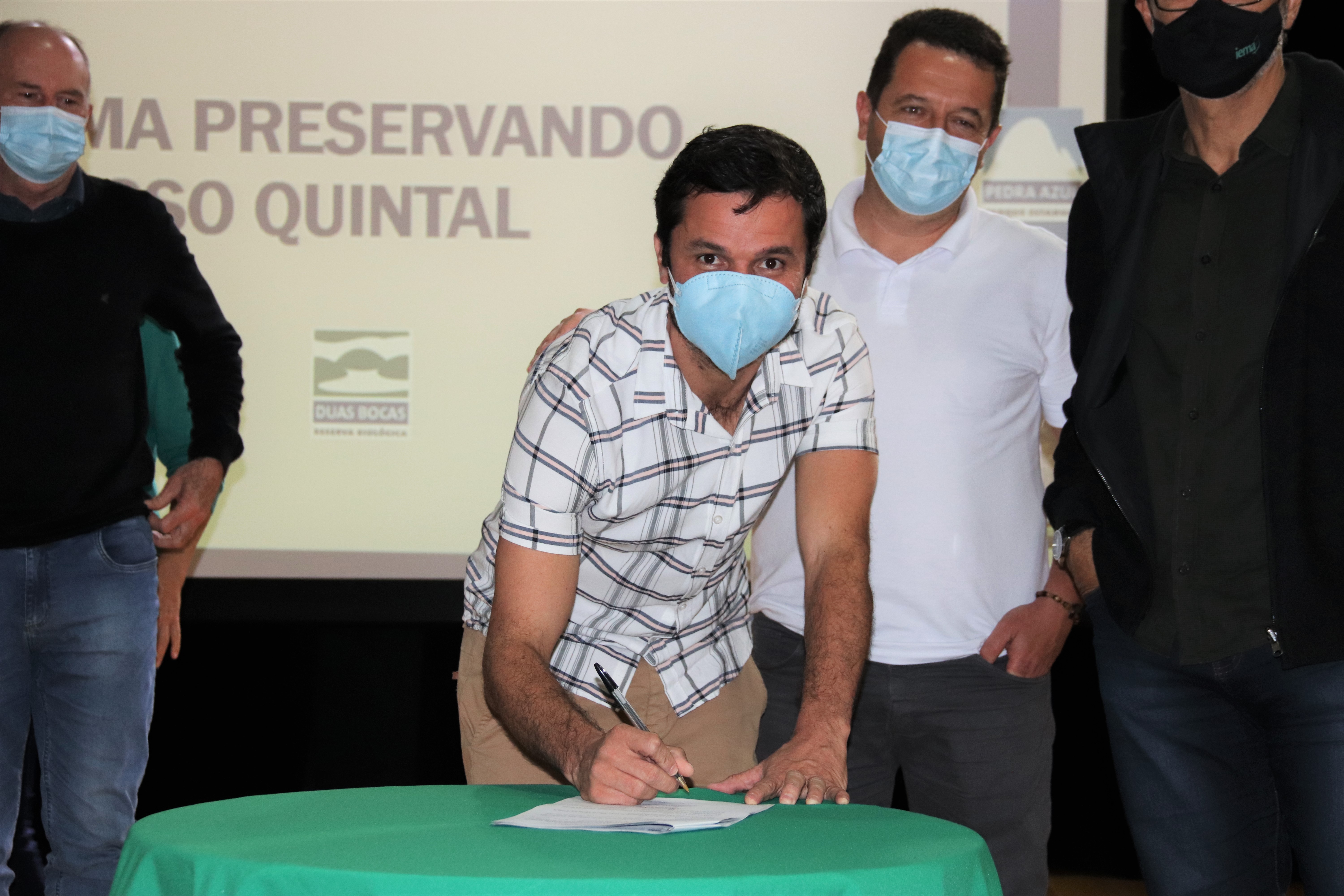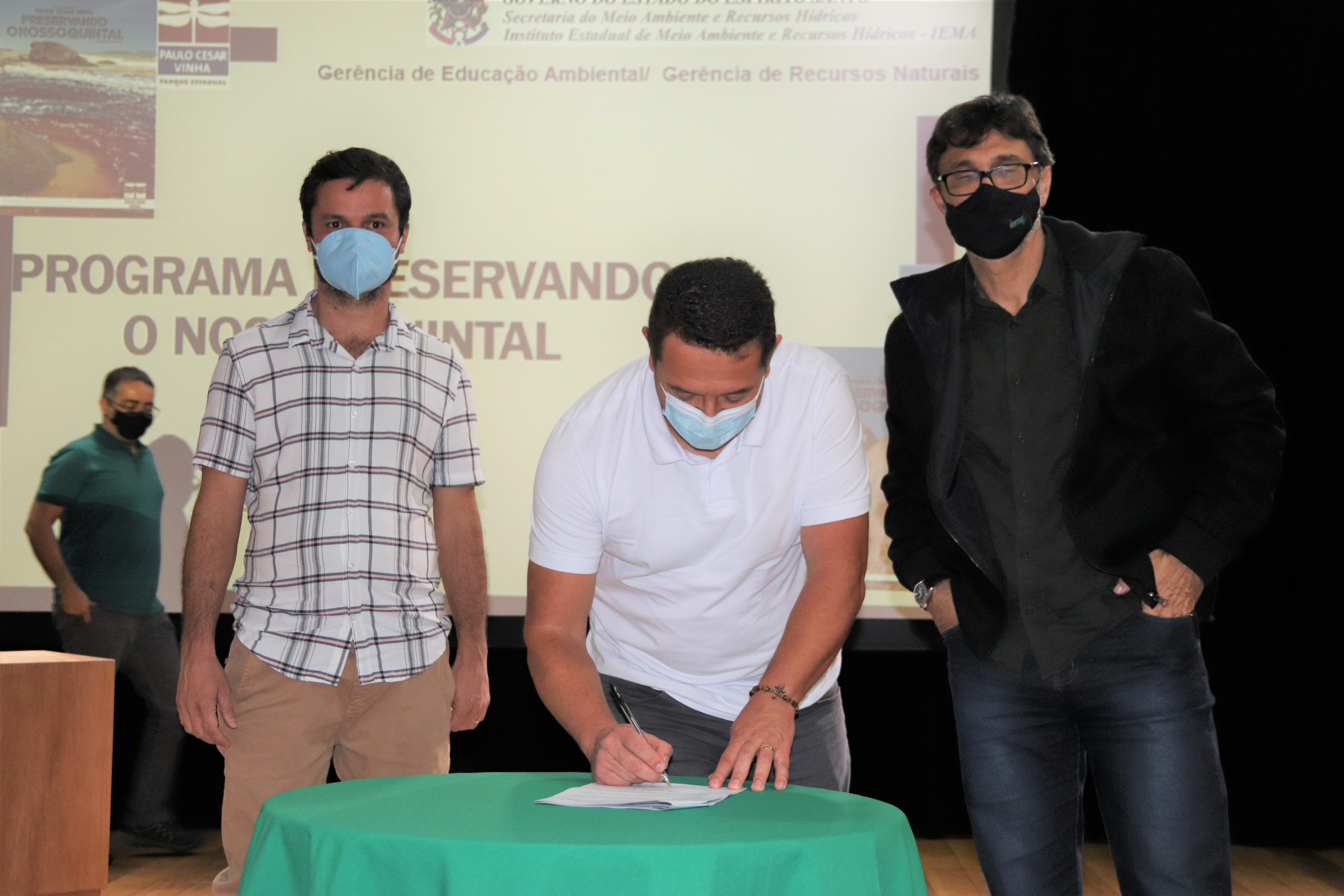 Para fortalecer e fomentar ações de educação ambiental na região, na manhã desta quinta-feira (24), a gestão municipal assinou o acordo de cooperação do “Preservando o Nosso Quintal”, projeto desenvolvido pelo Instituto Estadual de Meio Ambiente e Recursos Hídricos (Iema). Estiveram presentes na cerimônia, o diretor-presidente do Iema, Alaimar Ribeiro Rodrigues Fiuza, o prefeito de Venda Nova, Paulinho Mineti, o vice-prefeito, Tarcisio Bottacin, a gerente de Educação Ambiental do Iema, Anna Tristão, o secretário municipal de Meio Ambiente, Maxuel Bestete, e a vereadora Dé Caliman. Ainda estavam presentes secretários municipais, diretores e representantes de associações de Venda Nova ligadas ao meio ambiente. A abertura contou com uma apresentação do maestro da Banda Emiliano Pedrini Lorenção, Jorge Luiz Pereira da Silva,  da musica Planeta Agua, de Guilherme Arantes.