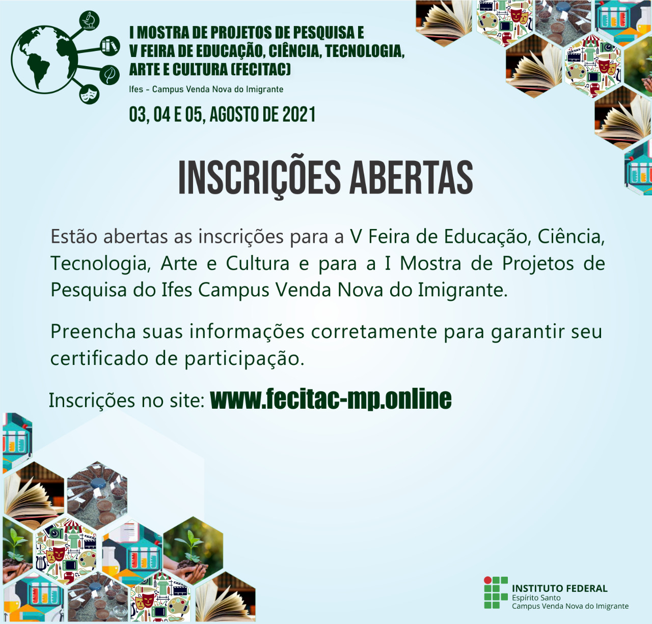 Estão abertas as inscrições para a V Feira de Educação, Ciência, Tecnologia, Arte e Cultura e para a I Mostra de Projetos de Pesquisa do Ifes Campus Venda Nova do Imigrante. As inscrições podem ser feitas online através do site da feira, disponível abaixo.