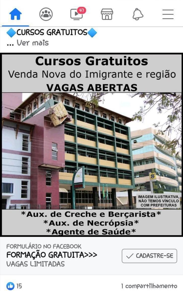 Está circulando na internet a imagem da Prefeitura de Venda Nova do Imigrante em um anúncio de cursos gratuitos em Venda Nova e Região do "Programa Mais Saúde".