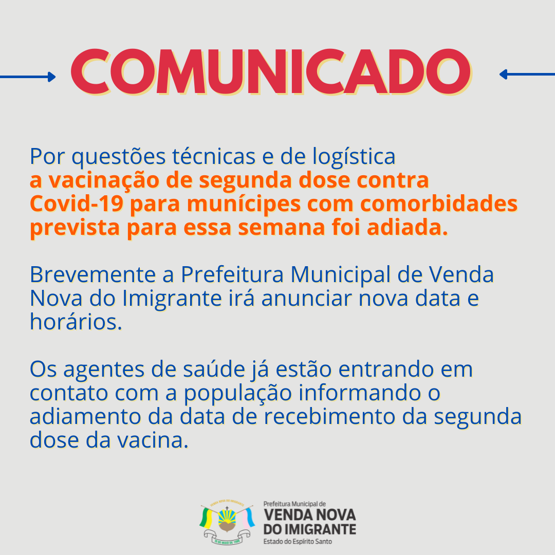 Por questões técnicas e de logística a vacinação D2 para munícipes com comorbidades prevista para essa semana foi adiada. Brevemente a Prefeitura Municipal de Venda Nova do Imigrante irá anunciar nova data e horários. Os agentes de saúde já estão entrando em contato com a população informando o adiamento da data de recebimento da segunda dose da vacina.