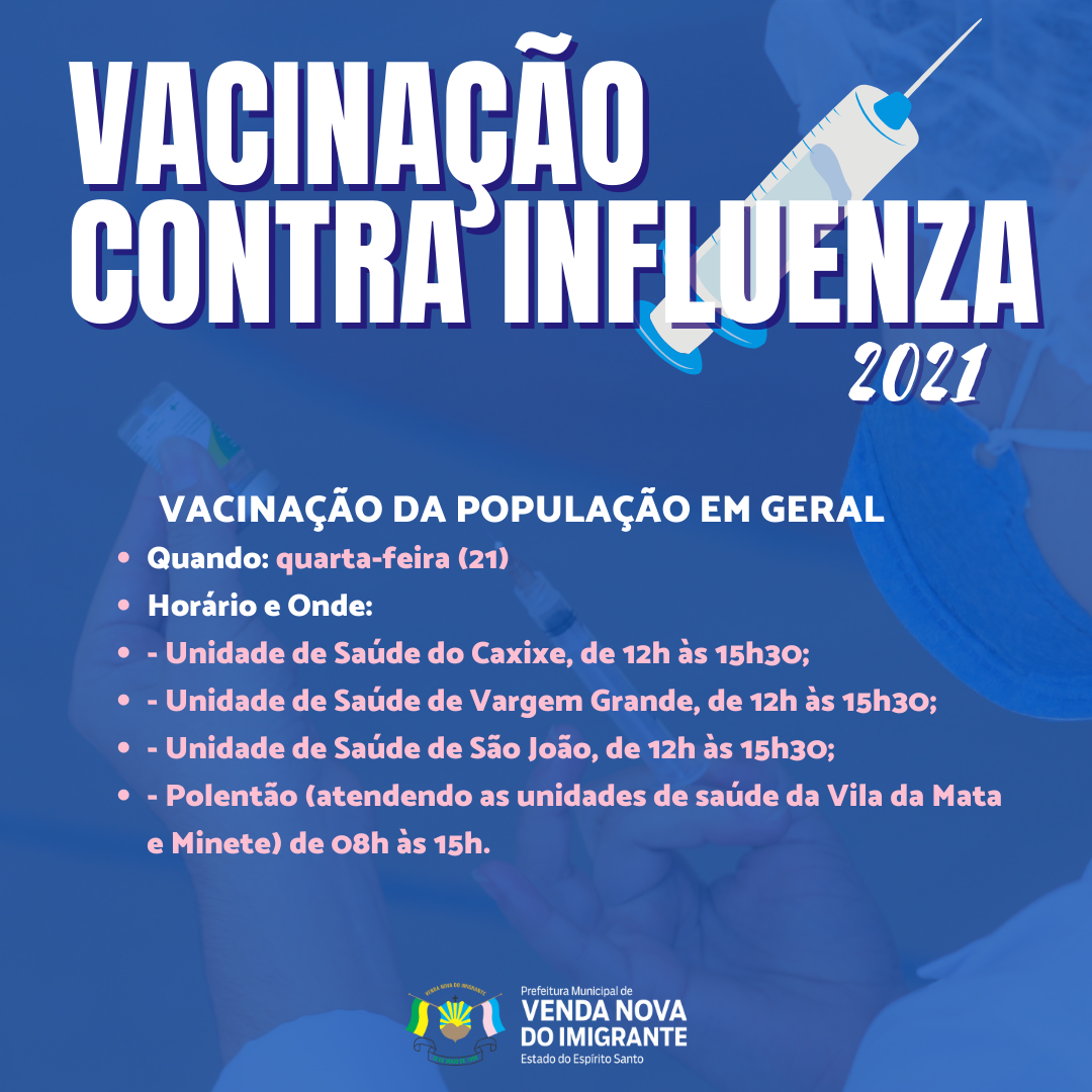 A Prefeitura de Venda Nova do Imigrante, através da Secretaria Municipal de Saúde, continua a campanha de vacinação contra o vírus da Influenza no Município. Nesta quarta-feira (21) serão disponibilizadas 1700 doses para a população em geral. O Munícipe deve fazer o agendamento da vacina no site da Prefeitura de Venda Nova no menu “Agendamento de Vacina”. Em caso de esgotamento do número de vagas, o munícipe deve aguardar a nova disponibilidade de vagas e vacinas. Confira: