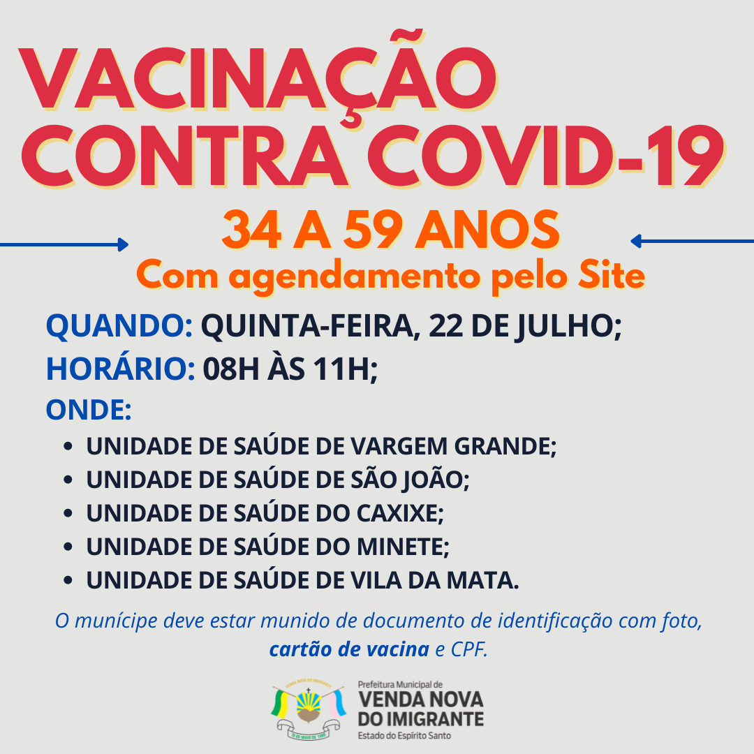 Prefeitura de Venda Nova do Imigrante, através da Secretaria Municipal de Saúde dará continuidade a vacinação dos munícipes contra a Covid-19, na próxima quinta-feira (22). A nova faixa etária a ser imunizada serão adultos de 34 a 59 anos residentes no Município.