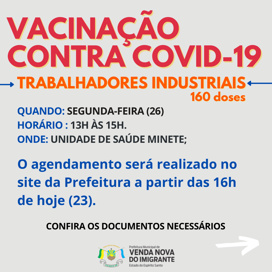 A Prefeitura de Venda Nova do Imigrante, através da Secretaria de Saúde, dá continuação a campanha de imunização dos munícipes contra o coronavírus. Nesta segunda-feira (26), de 13h às 15, na Unidade Básica de Saúde do Bairro Minete, trabalhadores industriais receberão a primeira dose de vacina contra a Covid-19. A empresa deve estar com CNAE de atividade econômica principal contemplado na lista definida pelo Governo do Estado.