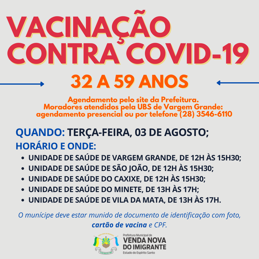 A Prefeitura de Venda Nova do Imigrante, através da Secretaria Municipal de Saúde, continua a imunização dos munícipes. Foram recebidas nesta segunda-feira (02) 500 doses do imunizante contra o coronavírus e nesta terça-feira (03) acontecerá a vacinação de adultos de 32 a 59 anos residentes no Município. O agendamento estará disponível a partir das 18h de hoje, 02 de agosto, no site da Prefeitura.