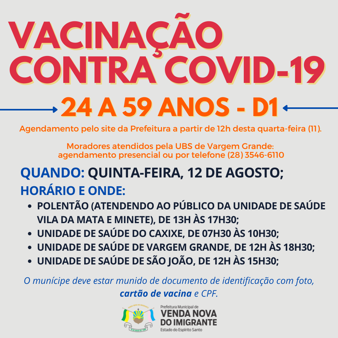 Mutirão contra Covid-19. A Prefeitura de Venda Nova do Imigrante, através da Secretaria Municipal de Saúde, continua a vacinação dos munícipes contra o coronavírus. Nesta quinta-feira (12) além dos adultos de 26 anos, uma nova faixa etária foi adicionada: 24 anos O agendamento estará disponível nesta quarta-feira (11), 12h no site da Prefeitura.
