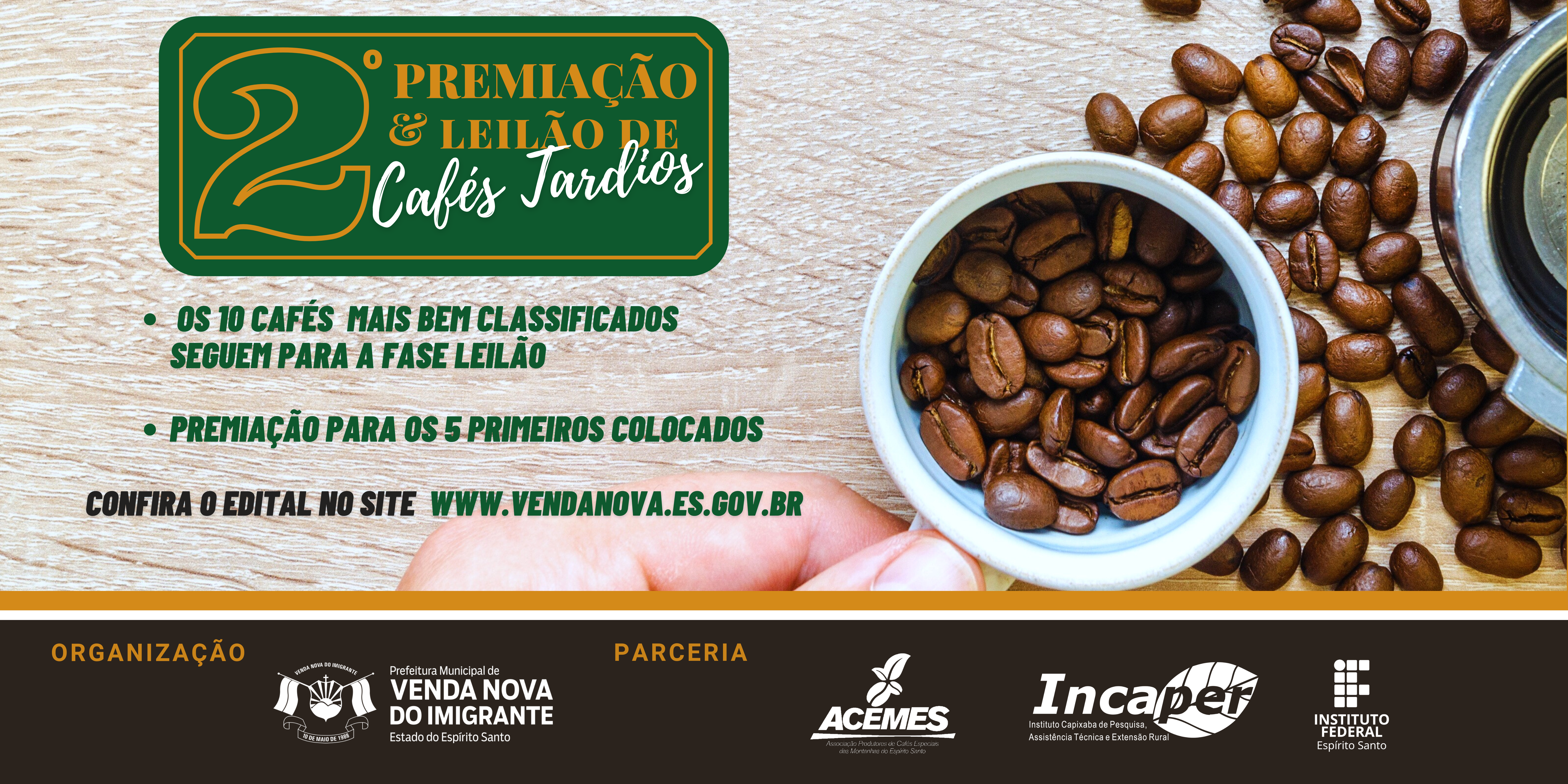 Os produtores de cafés especiais de Venda Nova do Imigrante irão ser premiados. A Prefeitura de Venda Nova, através da Secretaria Municipal de Agricultura, irá realizar a 2º Premiação e Leilão de Cafés Tardios de Qualidade do Município. As inscrições começam no dia 01 de setembro.