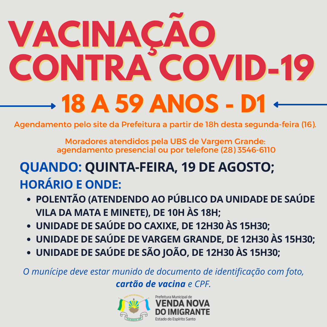 A Prefeitura de Venda Nova do Imigrante, através da Secretaria Municipal de Saúde, continua a vacinação dos munícipes contra a covid-19. Na próxima quinta-feira (19), adultos de 18 anos ou mais serão imunizados.