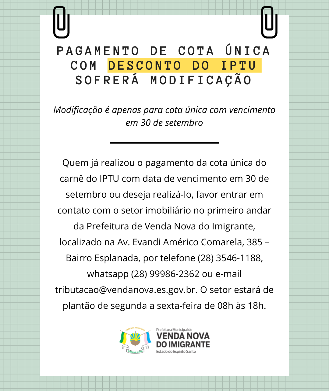 Quem já realizou o pagamento da cota única ou deseja realizá-lo, favor entrar em contato com o setor imobiliário no primeiro andar da Prefeitura de Venda Nova do Imigrante, localizado na Av. Evandi Américo Comarela, 385 – Bairro Esplanada, por telefone (28) 3546-1188, whatsapp (28) 99986-2362 ou e-mail tributacao@vendanova.es.gov.br. O setor estará de plantão de segunda a sexta 08h às 18h.