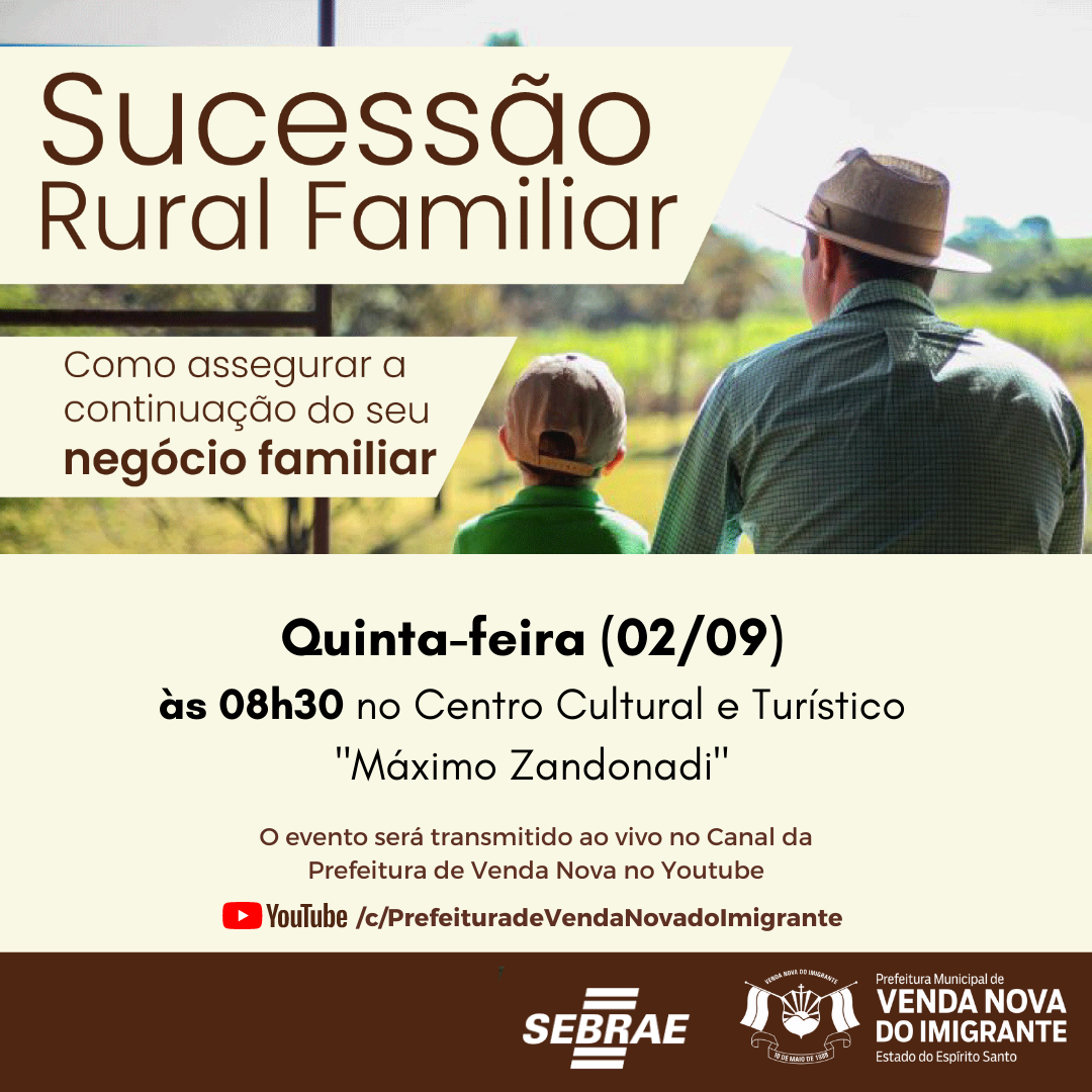 A Prefeitura de Venda Nova do Imigrante, em parceria com o Sebrae-ES realizará nesta quinta-feira (02) no Centro Cultural e Turístico o seminário “Sucessão Rural Familiar – Como assegurar a continuação do seu negócio familiar”. O evento será realizado às de 08h30 às 10h com o palestrante Francisco Vila e também será transmitido através do canal da Prefeitura de Venda Nova no Youtube. Acesse AQUI.