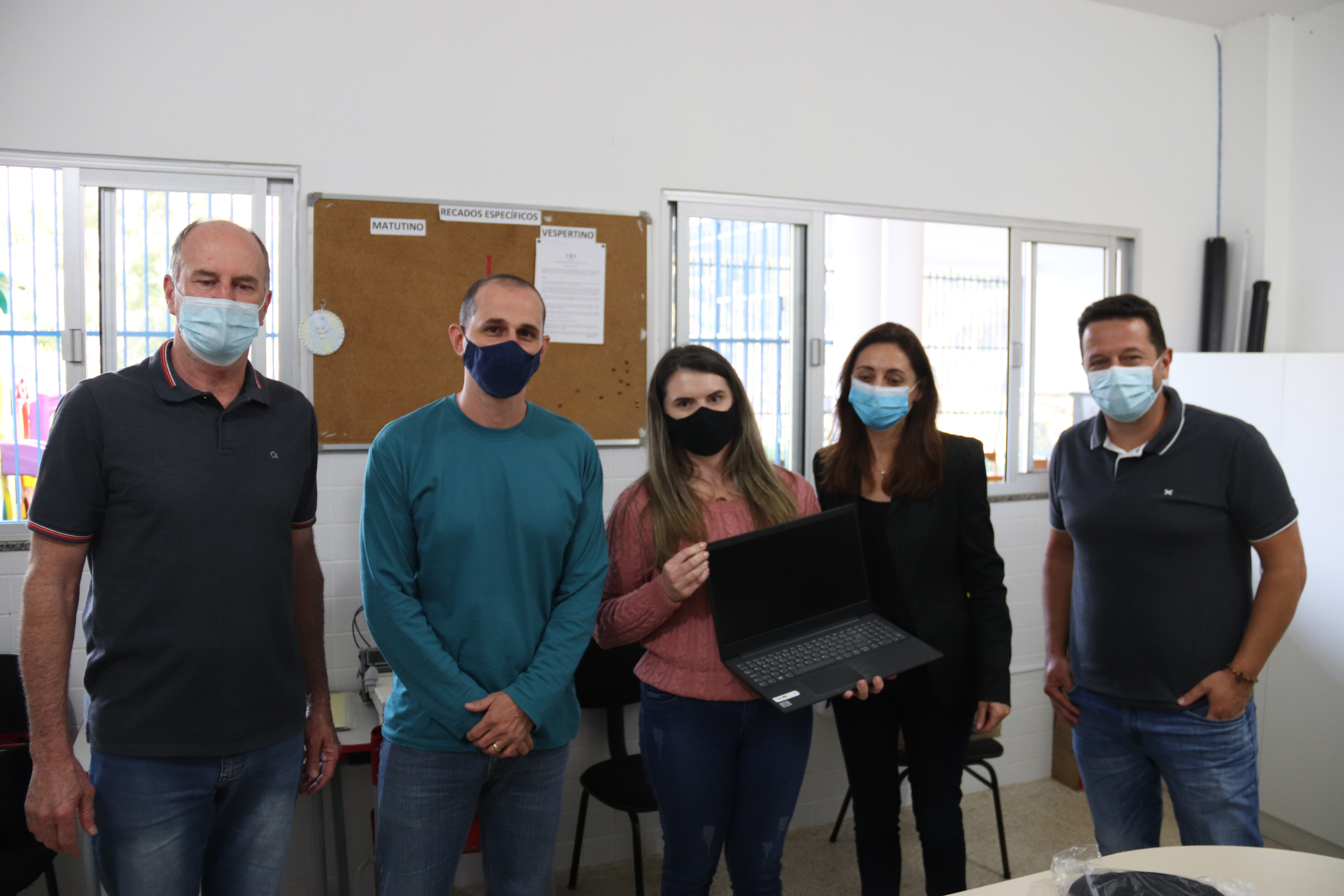 Na EMEI Antônio Roberto Feitosa foi entregue o notebook para a última funcionária a se efetivar na rede municipal, em julho de 2020, Cristiane Abílio Dordenoni. De acordo com Cristiane, “o ato representa um tipo de reconhecimento pelo esforço que fizemos no ano passado, onde tivemos que trabalhar com equipamentos pessoais. O notebook vai ajudar muito porque é uma tecnologia nova. A gente estava trabalhando com nosso computador que já estava um pouco ultrapassado e esse é bem mais moderno.”