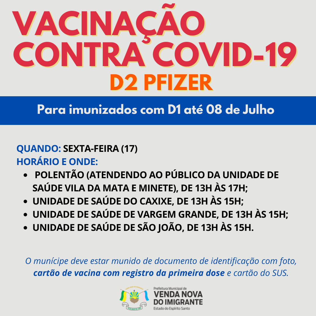 Na sexta-feira (17) ocorrerá a vacinação D2 da vacina Pfizer para quem recebeu a primeira dose do imunizante até o dia 08 de julho de 2021. O munícipe deve estar munido de documento de identificação com foto, cartão de vacina com registro da primeira dose e cartão do SUS.