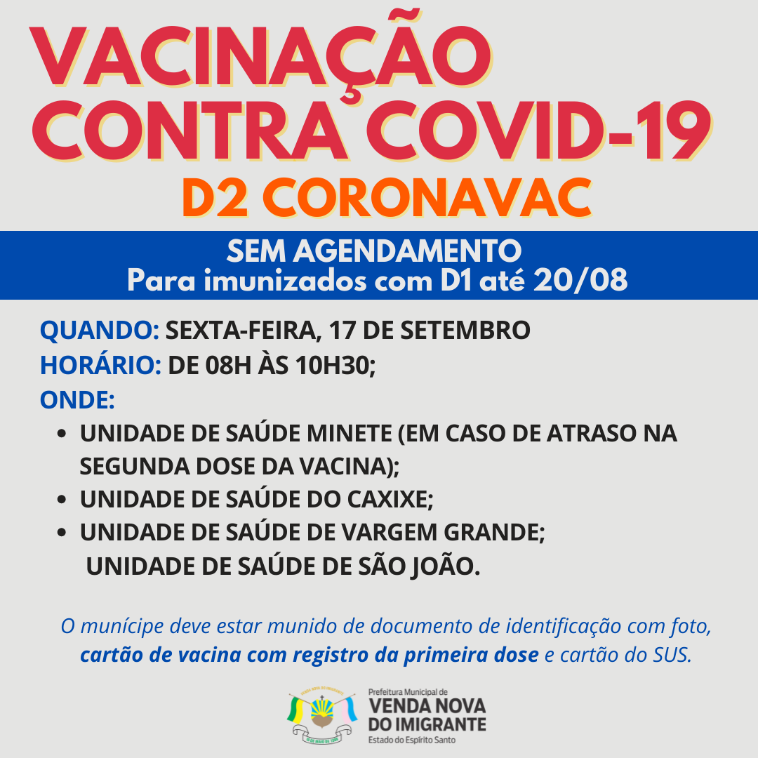 A Prefeitura de Venda Nova do Imigrante, através da Secretaria Municipal de Saúde, avança na campanha de imunização contra a Covid-19 dos munícipes. Nesta sexta-feira (17) será aplicada a segunda dose da Vacina Coronavac para aqueles que receberam a primeira dose do imunizante até 20 de agosto.
