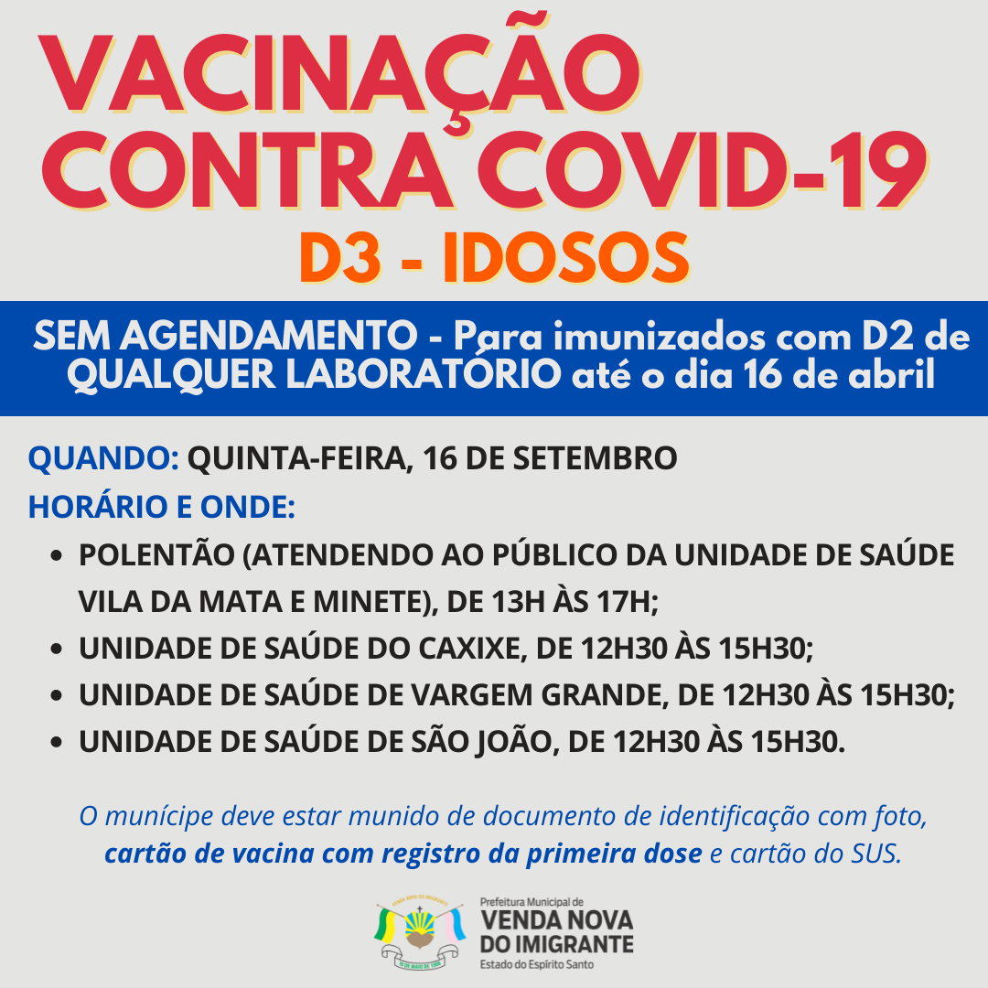 A Prefeitura de Venda Nova do Imigrante, através da Secretaria Municipal de Saúde, avança na campanha de imunização contra a Covid-19 dos munícipes. Nesta quinta-feira (16), os idosos residentes no Município que foram imunizados com a vacina de segunda dose de qualquer laboratório até o dia 16 de abril, receberão a terceira dose da vacina contra covid-19. A listagem dos idosos está disponível abaixo: