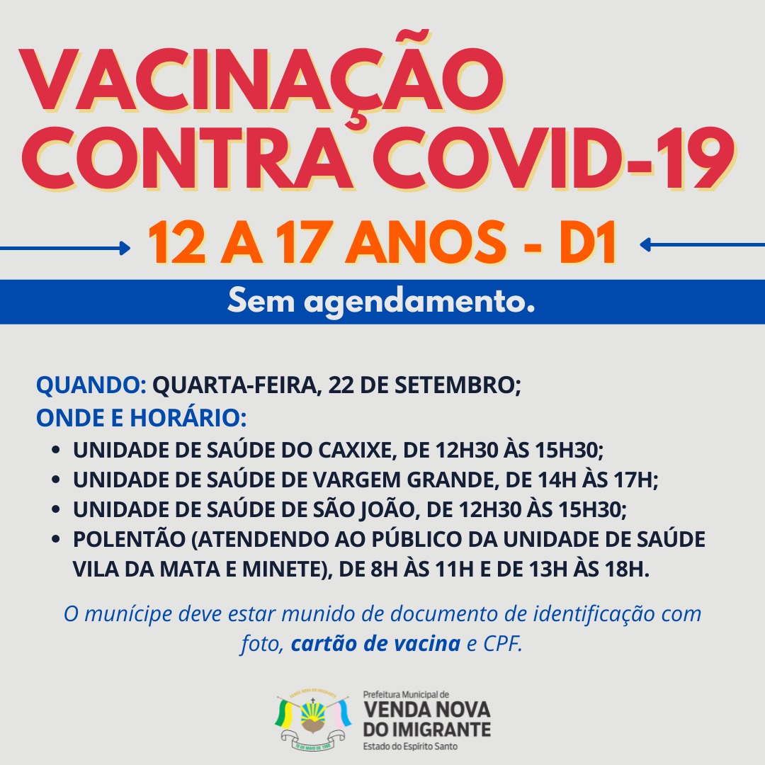 A Prefeitura de Venda Nova do Imigrante, através da Secretaria Municipal de Saúde, continua a campanha de imunização dos munícipes contra a covid-19. Em razão das 1400 doses recebidas para o público alvo, na quarta-feira (22), jovens 12 a 17 anos receberão a primeira dose do imunizante contra a covid-19.