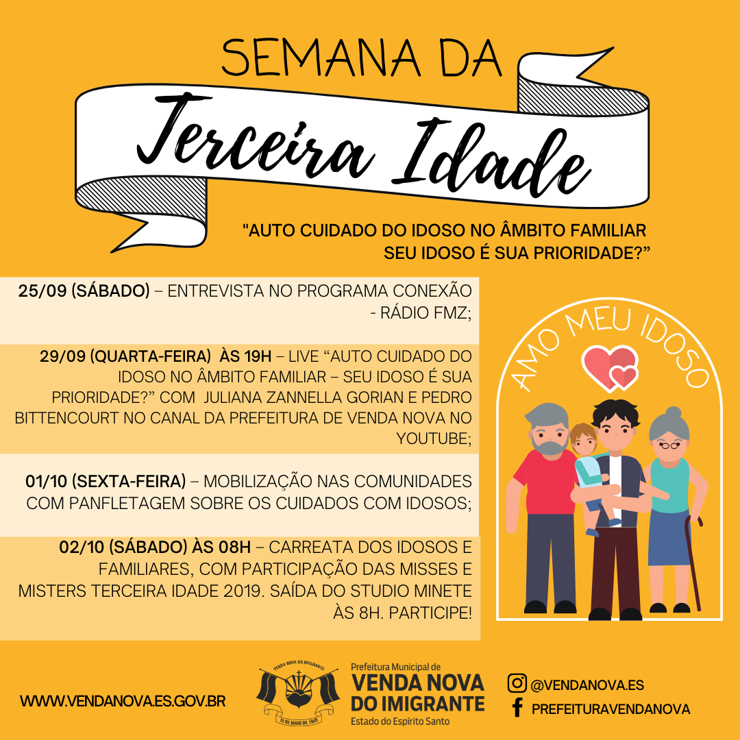 Em comemoração ao dia 1º de outubro, dia internacional do idoso, a Prefeitura de Venda Nova do Imigrante, através da Secretaria Municipal de Assistência Social, realizará a partir deste sábado (25), a semana da terceira idade 2021. Com temática “Auto cuidado do idoso no âmbito familiar – Seu idoso é sua prioridade?” A programação conta com lives, entrevistas e carreata.