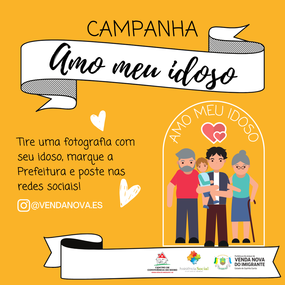 Tem idoso em casa? Demonstre seu amor na Campanha “Amo meu idoso”! É bem fácil, basta tirar uma foto com seu idoso e postar no instagram (story ou feed) marcando a Prefeitura de Venda Nova (@vendanova.es). Iremos publicar as fotografias no Instagram da Prefeitura no dia do idoso, dia 01 de outubro.