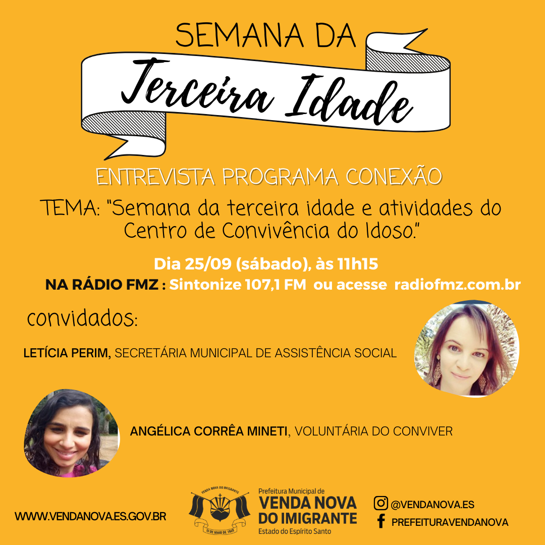 25/09 (Sábado) – Entrevista no Programa Conexão – Com Letícia Perim, secretária de Assistência Social de Venda Nova e Angélica Mineti, colaboradora no grupo de voluntários do Centro de Convivência do Idoso, falando sobre o trabalho do Centro de Convivência do Idoso durante a pandemia.