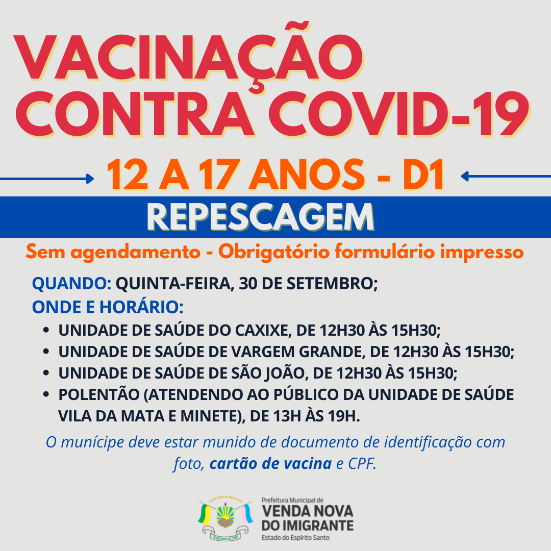 A Prefeitura de Venda Nova do Imigrante, através da Secretaria Municipal de Saúde, continua a campanha de imunização dos munícipes contra a covid-19. Nesta quinta-feira, 30 de setembro, jovens 12 a 17 anos receberão a primeira dose do imunizante contra a covid-19.