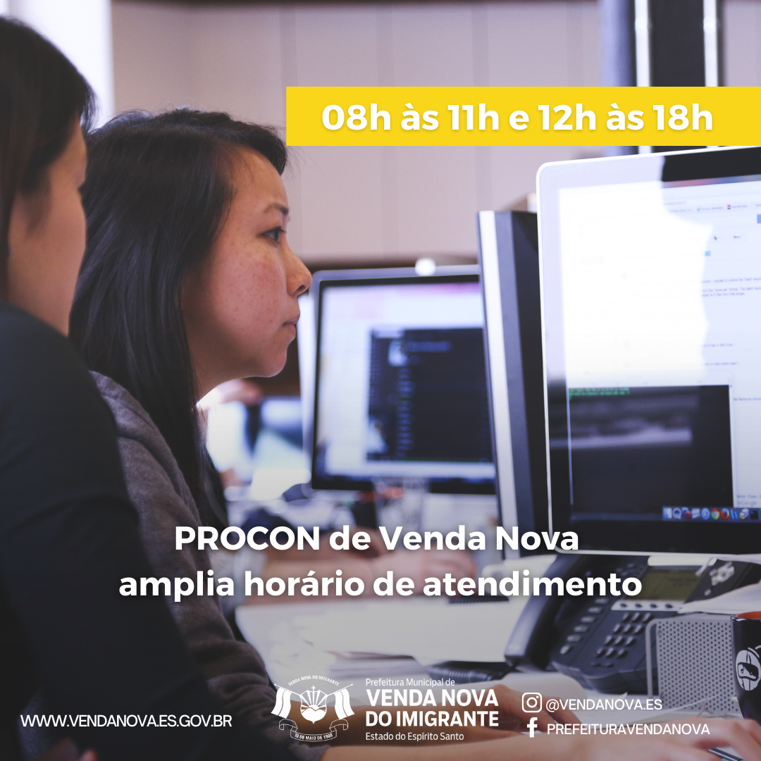 Com intuito de melhor atender os vendanovenses que buscam os serviços do órgão de defesa do consumidor, o Procon de Venda Nova do Imigrante ampliou o horário de atendimento: de 8h às 11h e de 12h às 18h, de segunda a sexta-feira.