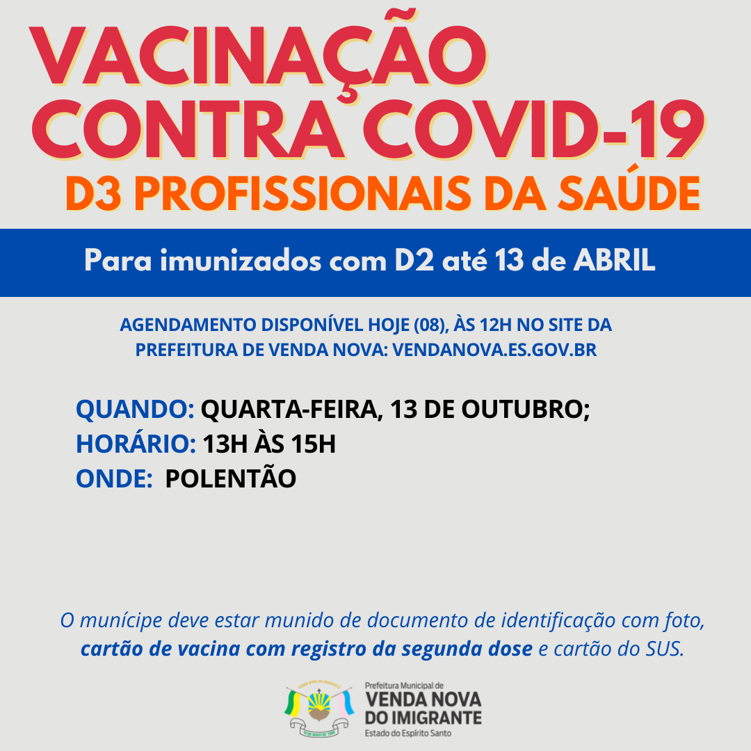 A Prefeitura de Venda Nova do Imigrante, através da Secretaria Municipal de Saúde, continua a campanha de imunização dos munícipes contra a covid-19. Nesta quarta-feira (13), no Centro de Eventos Padre Cleto Caliman (Polentão) os profissionais de saúde atuantes no Munícipio que receberam a segunda dose do imunizante até o dia 13 de abril receberão a dose de reforço contra a covid.