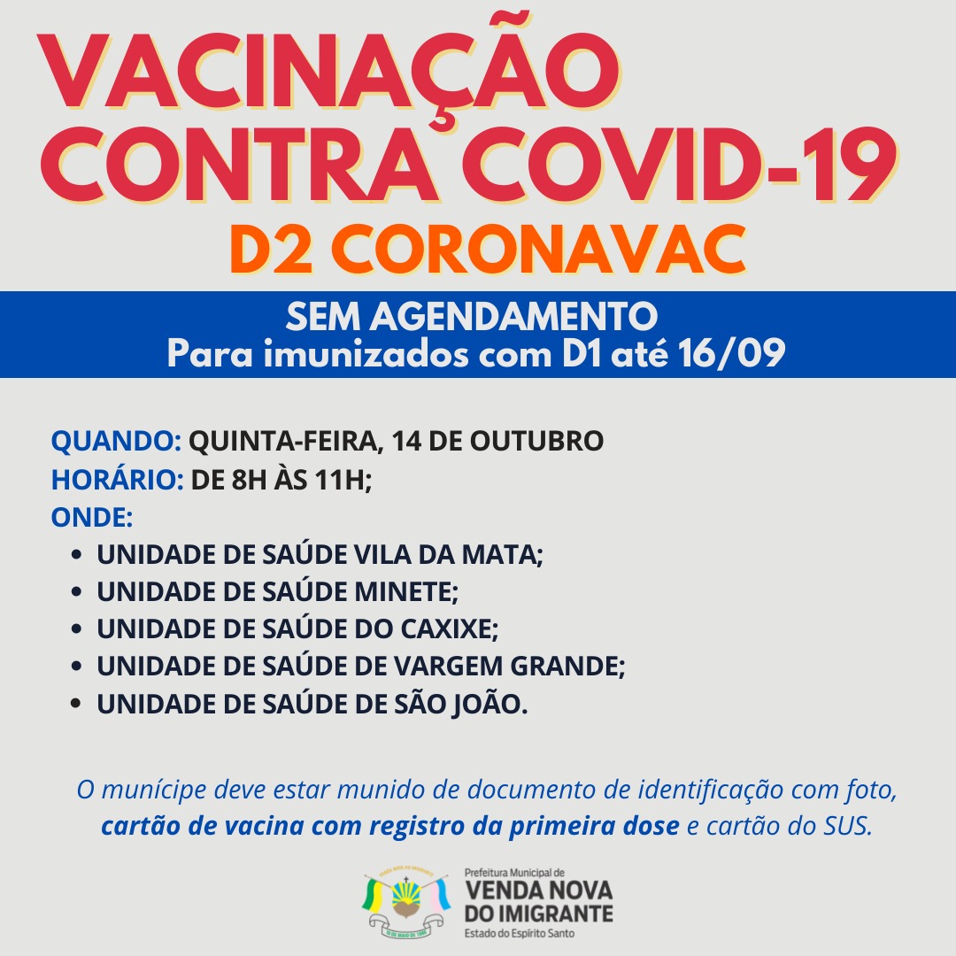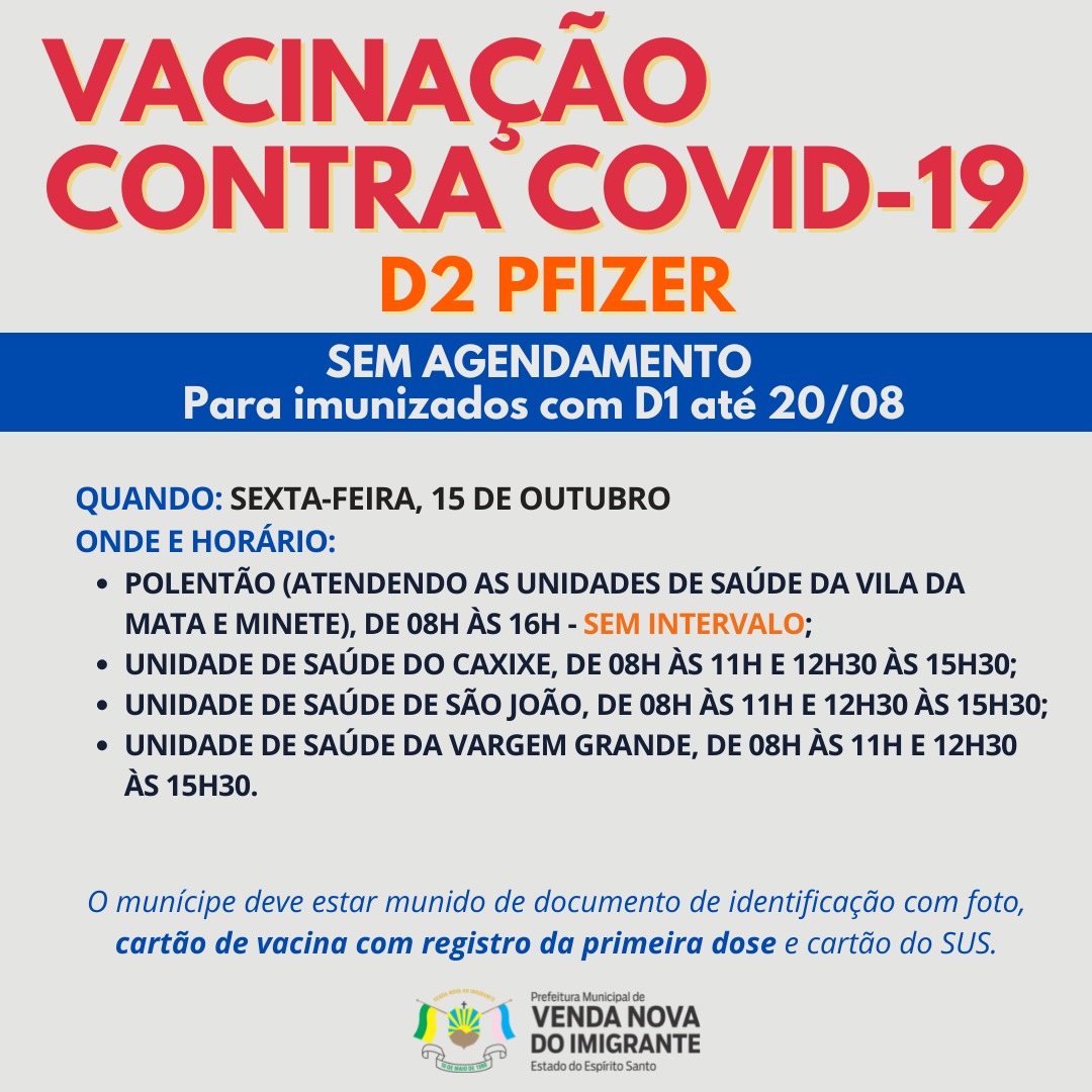 A Prefeitura de Venda Nova do Imigrante, através da Secretaria Municipal de Saúde, continua a campanha de imunização dos munícipes contra a covid-19. No ato da vacinação o munícipe deve estar munido de documento de identificação com foto, cartão de vacina com registro da primeira dose e CPF. Confira as datas, horários e locais abaixo: