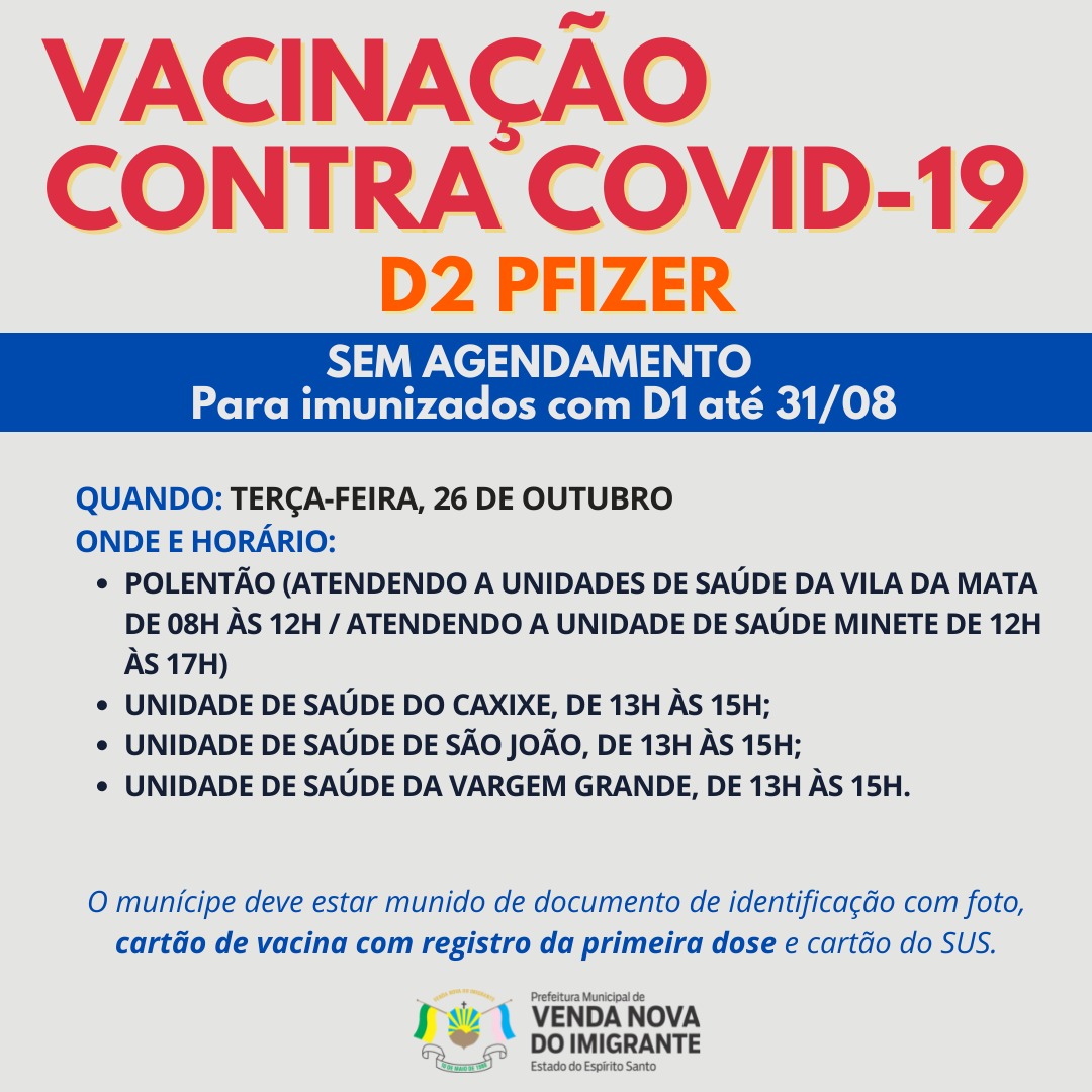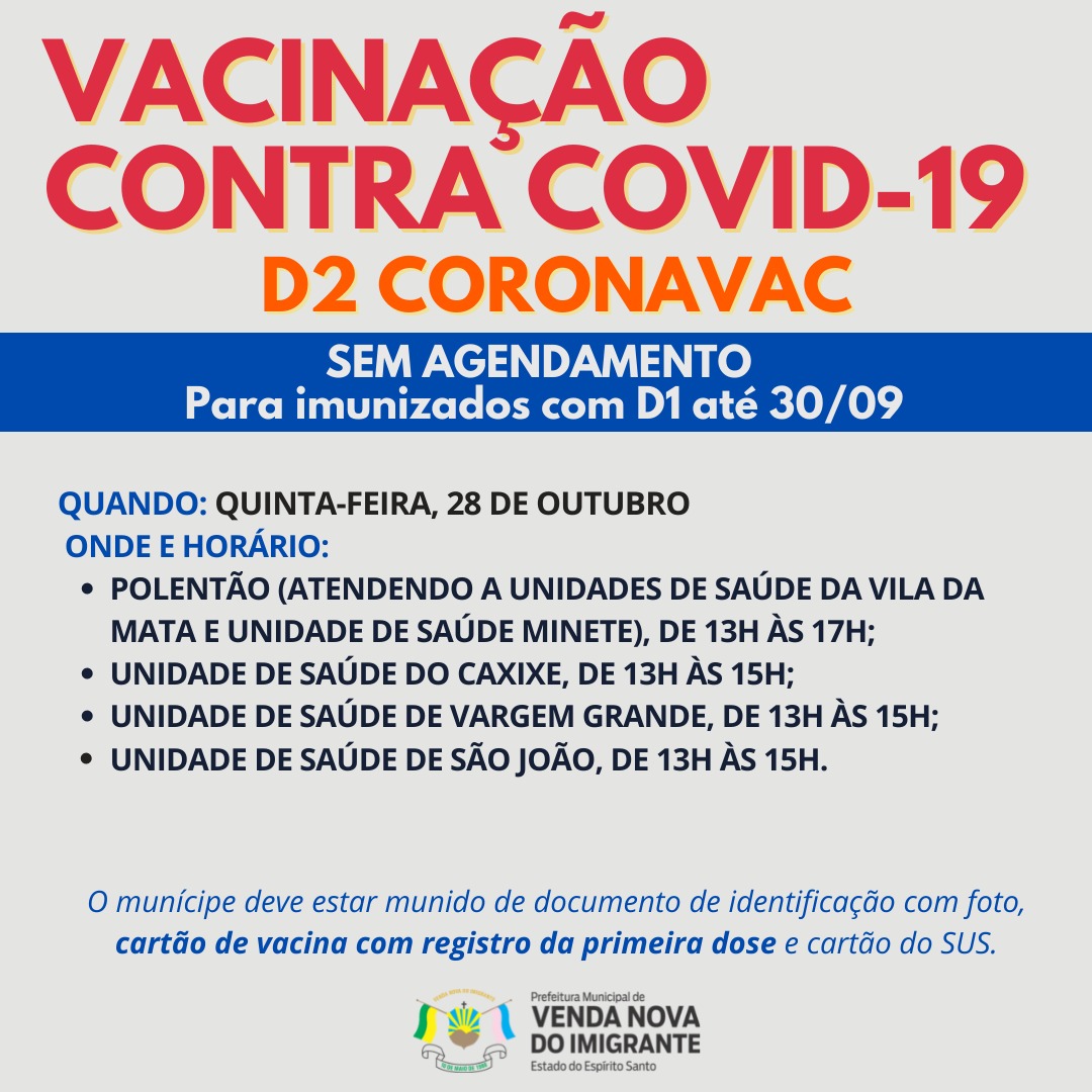A Prefeitura de Venda Nova do Imigrante, através da Secretaria Municipal de Saúde, continua a campanha de imunização dos munícipes contra a covid-19. No ato da vacinação o munícipe deve estar munido de documento de identificação com foto, cartão de vacina com registro da primeira dose e CPF. Confira as datas, horários e locais abaixo: