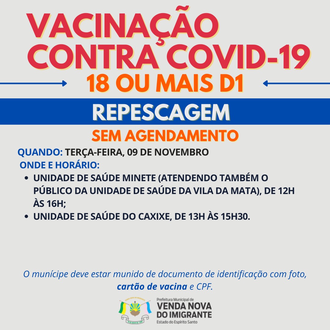A Prefeitura de Venda Nova do Imigrante, através da Secretaria Municipal de Saúde, continua a campanha de imunização dos munícipes contra a covid-19. Os munícipes com mais de 18 anos que ainda não vacinaram poderão receber a primeira dose do imunizante nesta terça-feira (09).