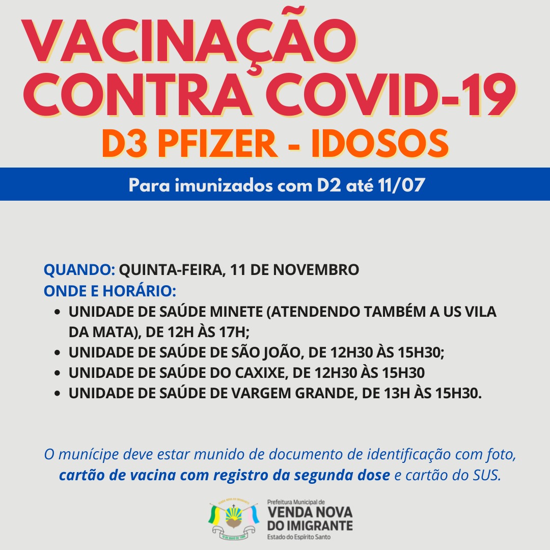 A Prefeitura de Venda Nova do Imigrante, através da Secretaria Municipal de Saúde, continua a campanha de imunização dos munícipes contra a covid-19. Os idosos que receberam a segunda dose do imunizante Pfizer até 11 de julho, receberão a dose de reforço contra a Covid. Confira horário e local abaixo: