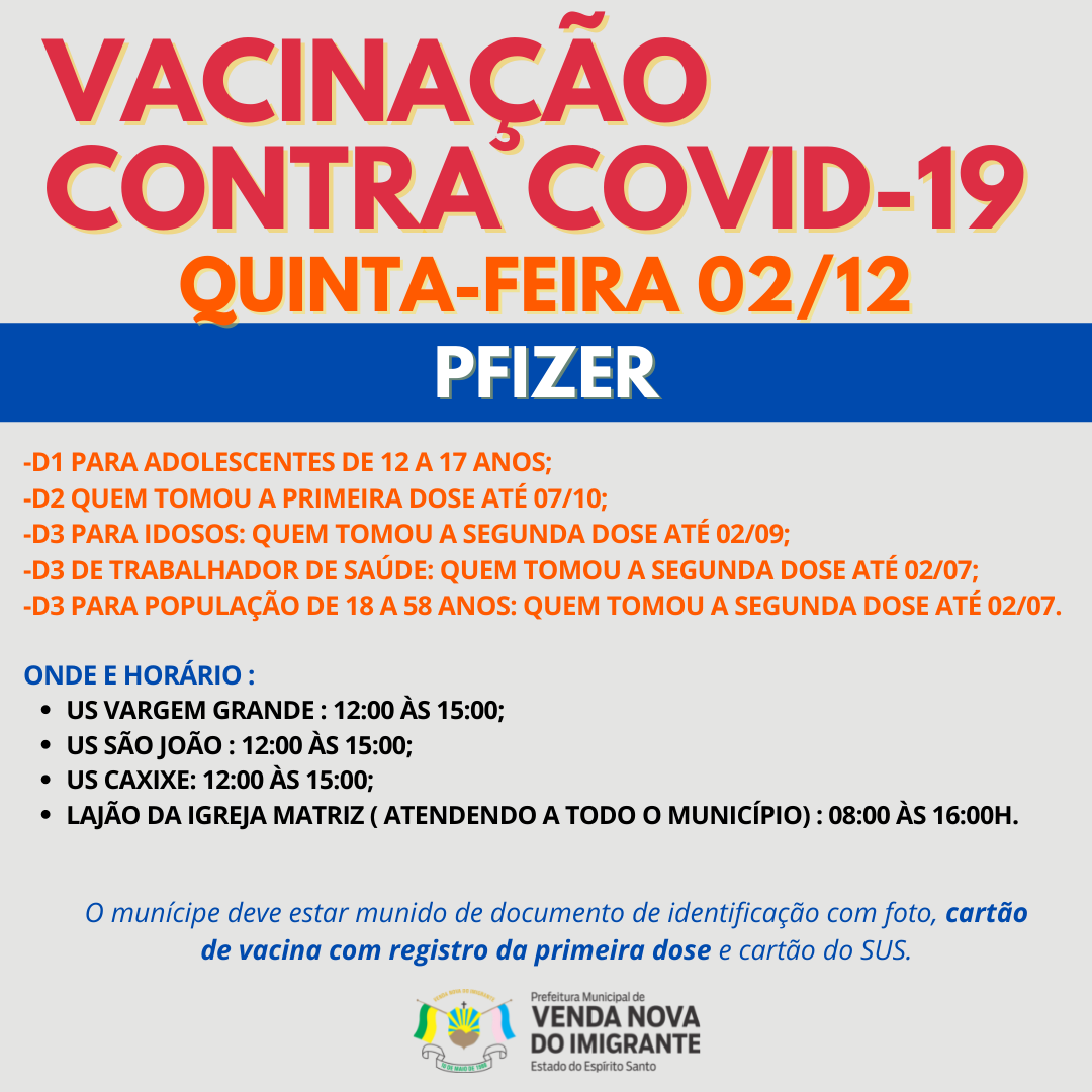 A Prefeitura de Venda Nova do Imigrante, através da Secretaria Municipal de Saúde, continua a campanha de imunização dos munícipes contra a covid-19.  Nessa quarta-feira (01) e quinta-feira(02), serão aplicadas primeira, segunda e terceira dose da vacina contra covid. Confira o cronograma abaixo.