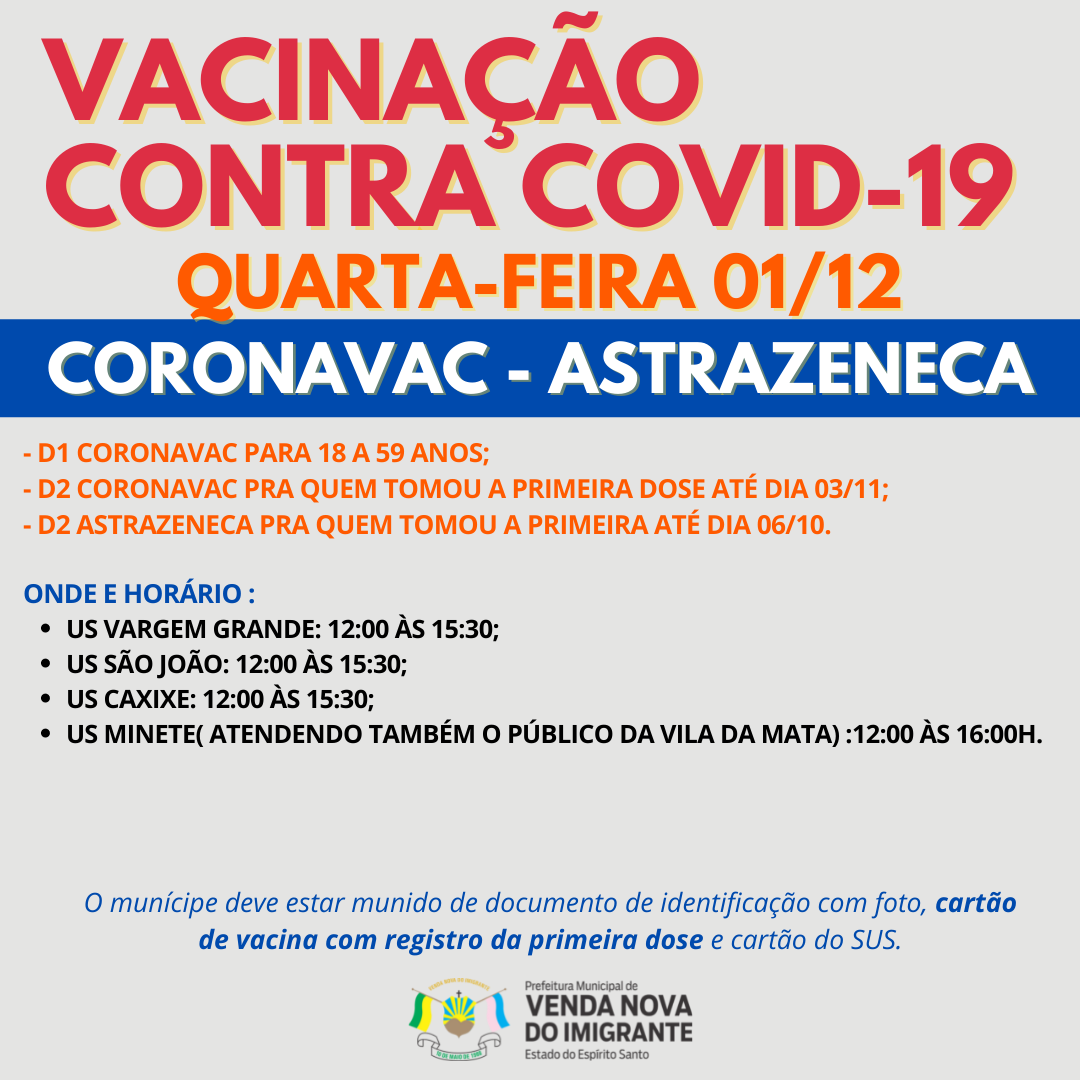 Quarta-feira – 01/12 – VACINA ASTRAZENECA – VACINA CORONAVAC