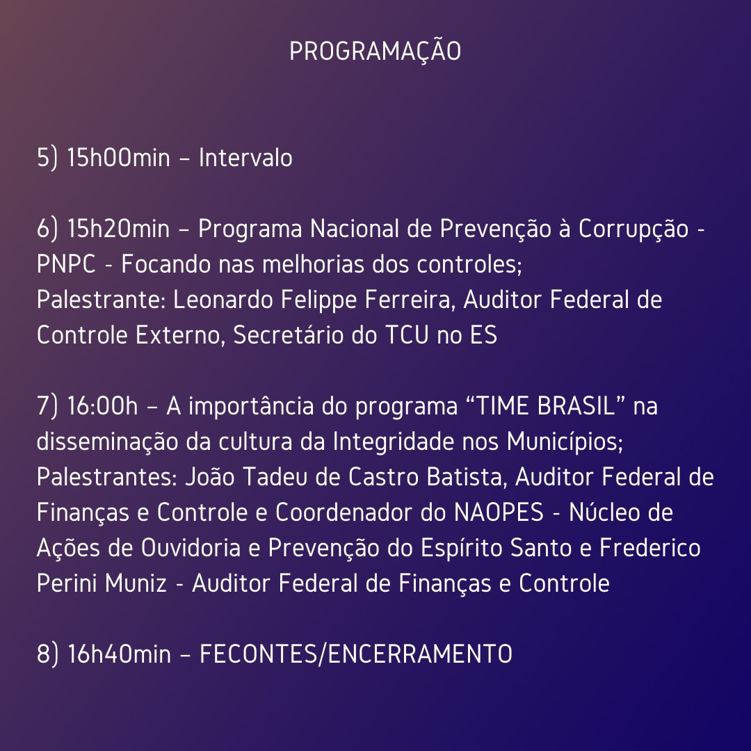 7) 16:00h – A importância do programa “TIME BRASIL” na disseminação da cultura da Integridade nos Municípios; Palestrantes: João Tadeu de Castro Batista, Auditor Federal de Finanças e Controle e Coordenador do NAOPES - Núcleo de Ações de Ouvidoria e Prevenção do Espírito Santo e Frederico Perini Muniz - Auditor Federal de Finanças e Controle