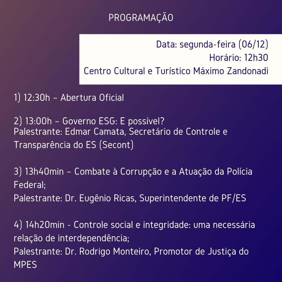 O evento acontecerá no dia 06 de dezembro, às 12h30min, no Centro Cultural e Turístico “Máximo Zandonadi” e contará com a participação de palestrantes das áreas de direito, promotoria, segurança pública e controladoria, que compartilharão conhecimento através de palestras relacionadas à temática. As inscrições podem ser realizadas através do link: https://bit.ly/3DCV4IU