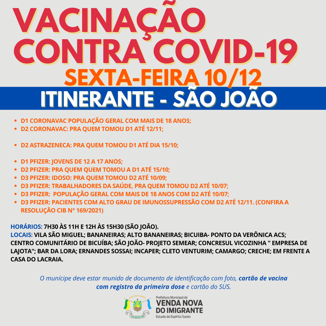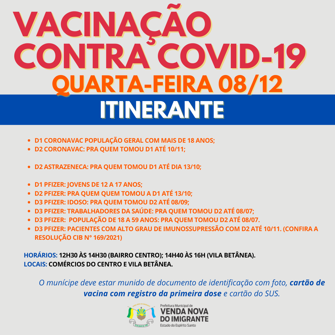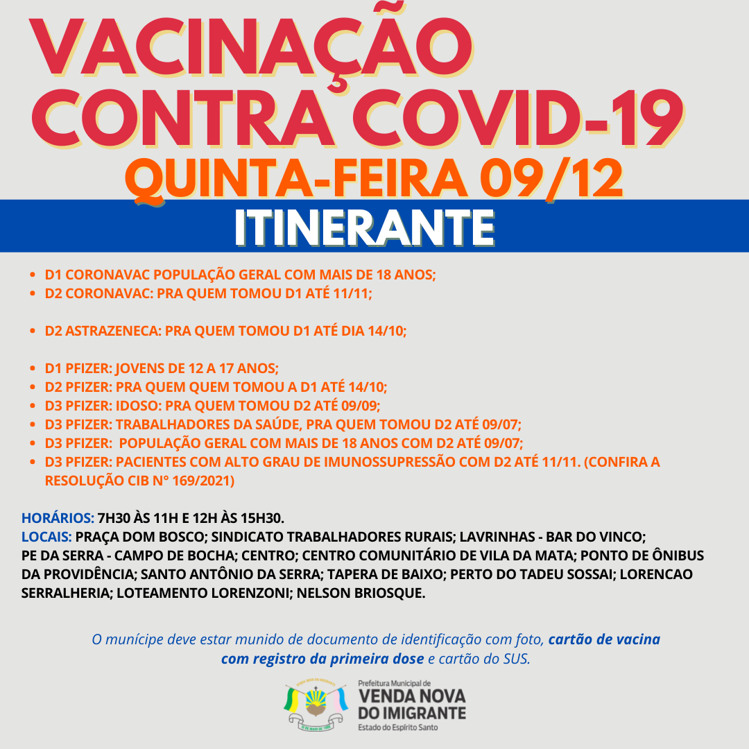A Prefeitura de Venda Nova do Imigrante continua a imunização dos munícipes contra a Covid-19. Nesta quarta-feira (08), quinta-feira (09) e sexta-feira (10), o carro da vacina percorrerá comunidades do Município aplicando doses de D1 para adolescentes de 12 a 17 anos, segunda dose de Pfizer, Astrazêneca e Coronavac além de terceira dose para idosos, trabalhadores da saúde, Pacientes com alto grau de imunossupressão (vide RESOLUÇÃO N° 169/2021 da Comissão Intergestores Bipartite - CIB) e população com idade maior de 18 anos.
